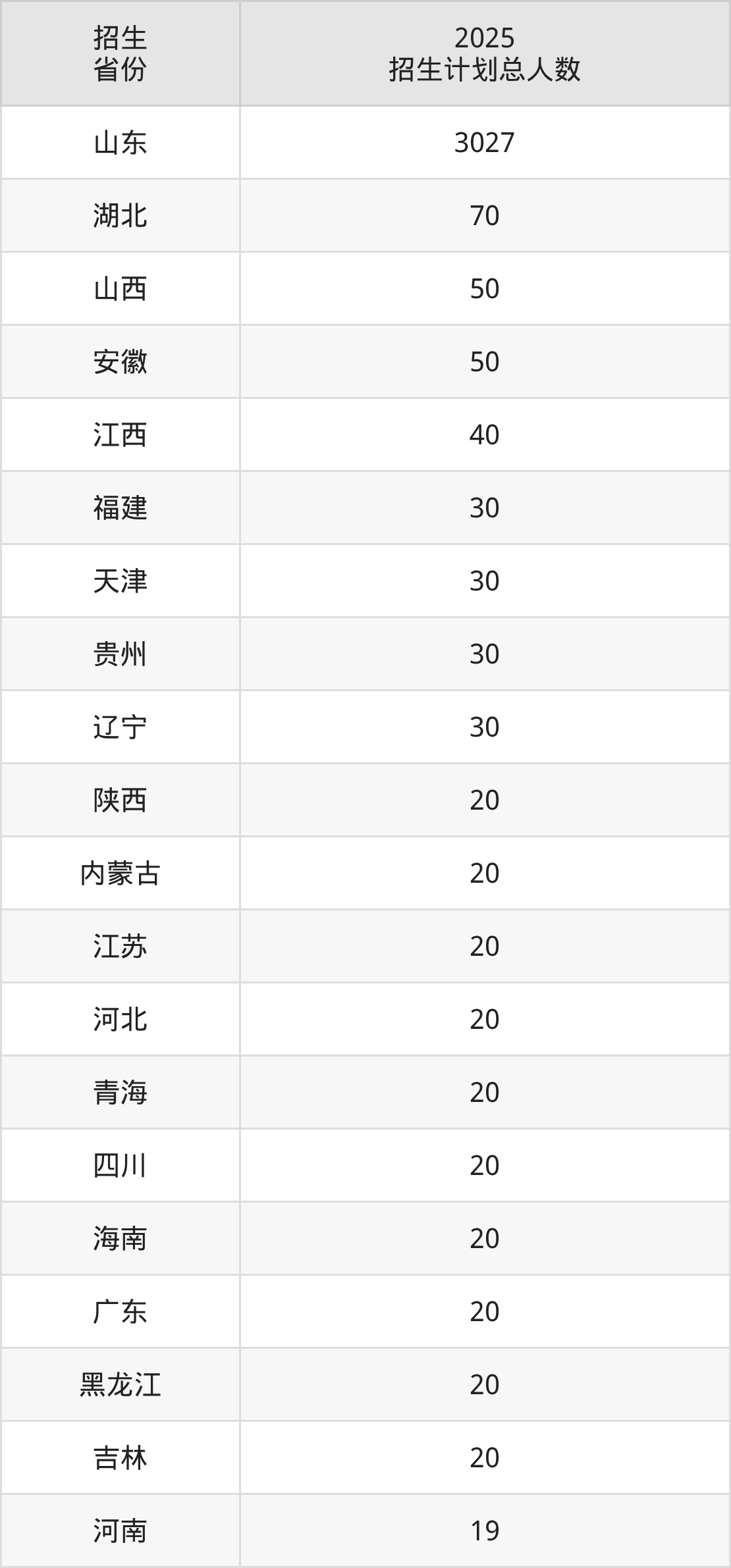 2025年山东中医药大学面向全国27个省市开展本科招生;招生专业共31个,招生人数共3637人。2025年在山东省招生计划总人数是3027人,其中,山东中医药大学在山东省招生人数最多的是中医学。山东中医药大学在各省具体招生人数情况如下表。