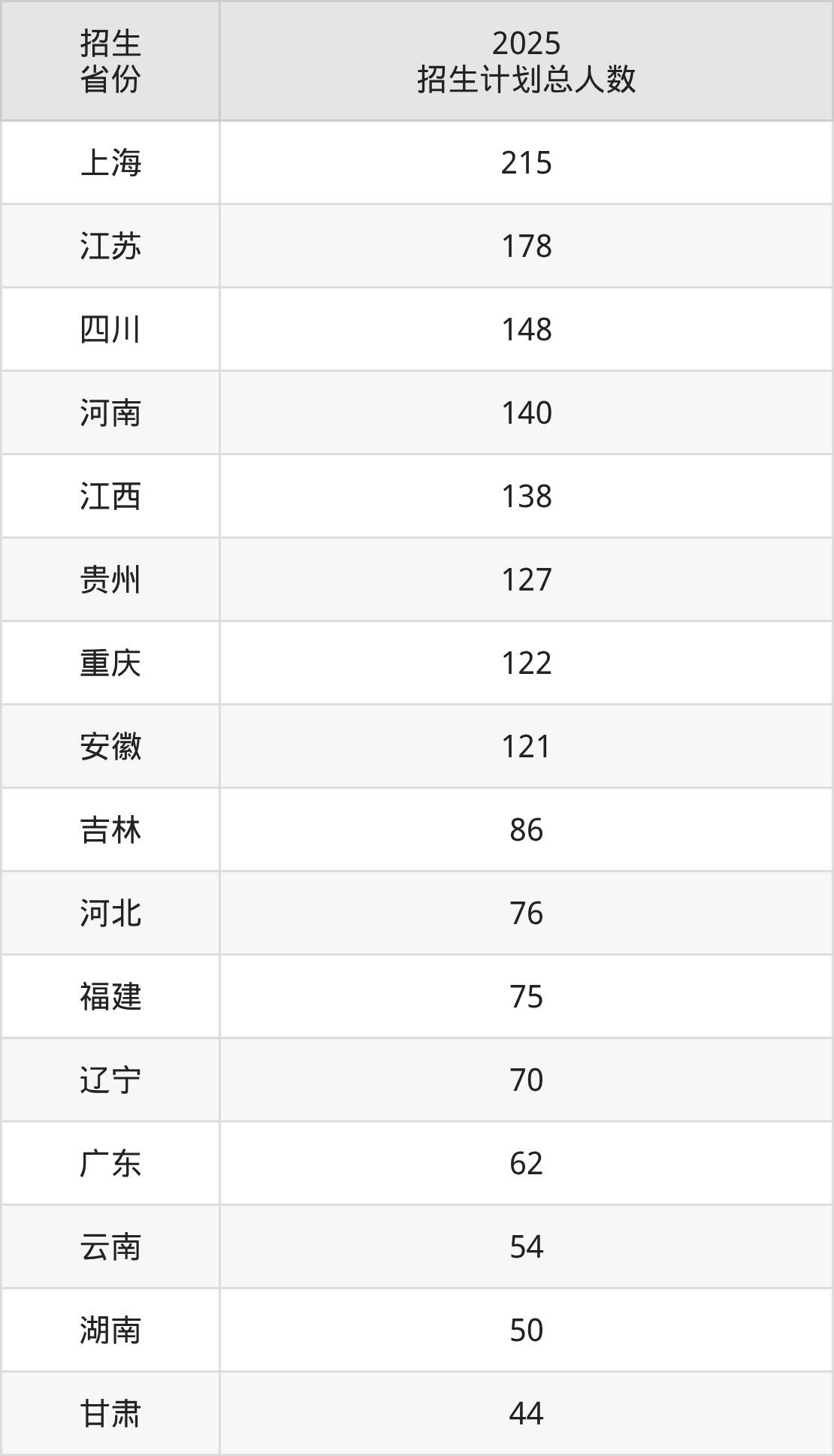 2025年华东师范大学面向全国26个省市开展本科招生;招生专业共47个,招生人数共1914人。2025年在上海市招生计划总人数是215人,其中,华东师范大学在上海市招生人数最多的是软件工程。华东师范大学在各省具体招生人数情况如下表。