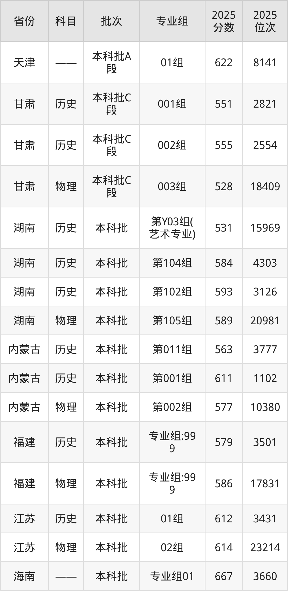普通类本科历史类最低573分,本科物理类最低610分