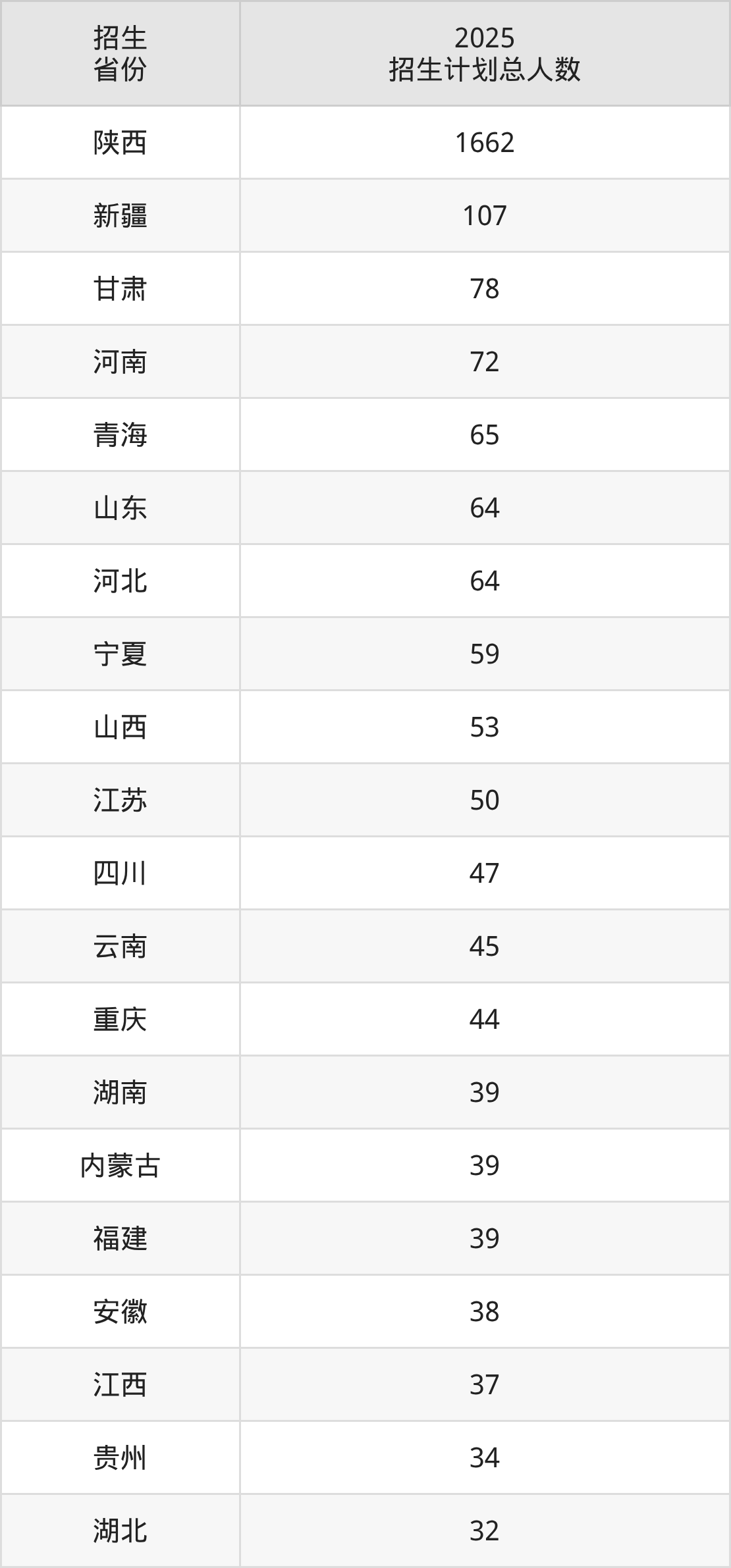 2025年西北政法大学面向全国29个省市开展本科招生;招生专业共21个,招生人数共2868人。2025年在陕西省招生计划总人数是1662人,其中,西北政法大学在陕西省招生人数最多的是法学。西北政法大学在各省具体招生人数情况如下表。