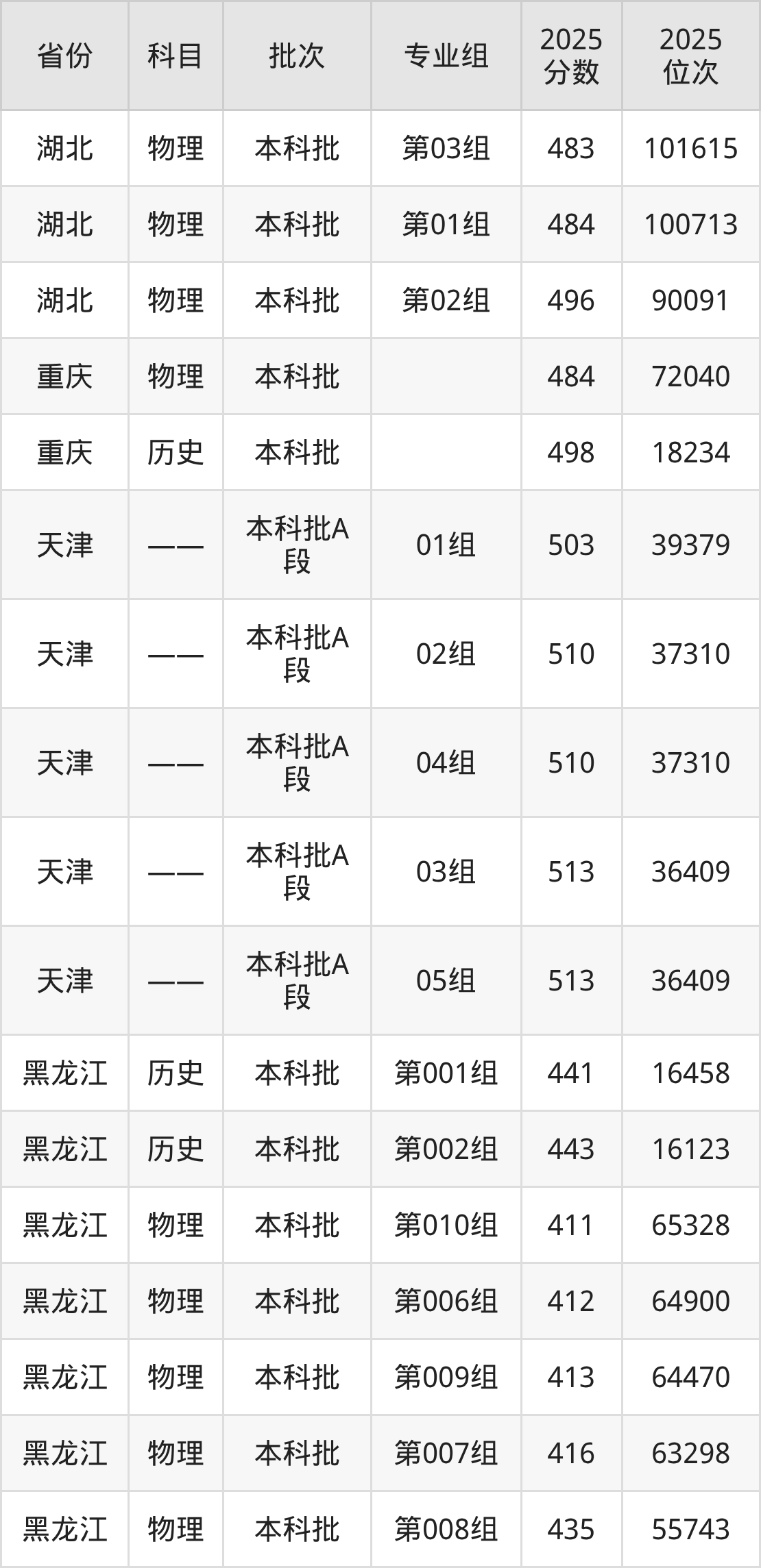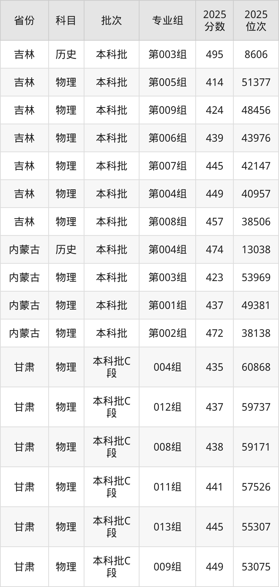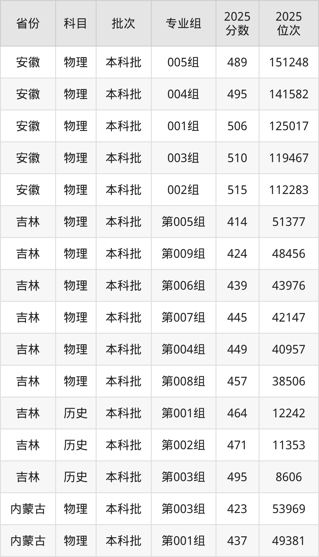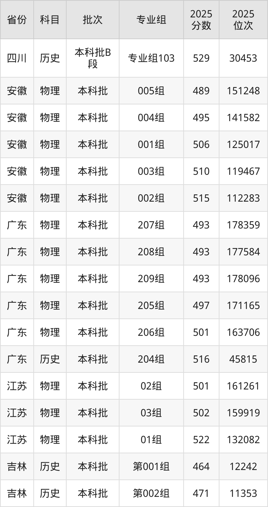 2025年在本科物理类进行招生,各专业组分数线详情如下: