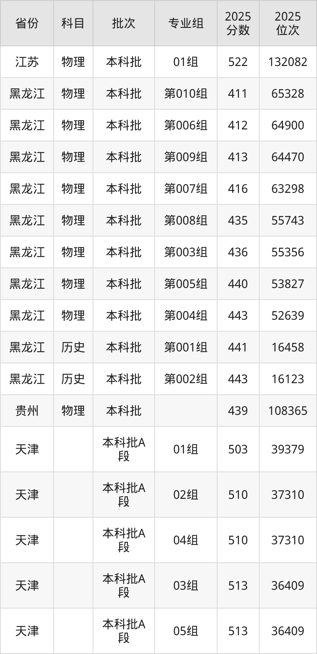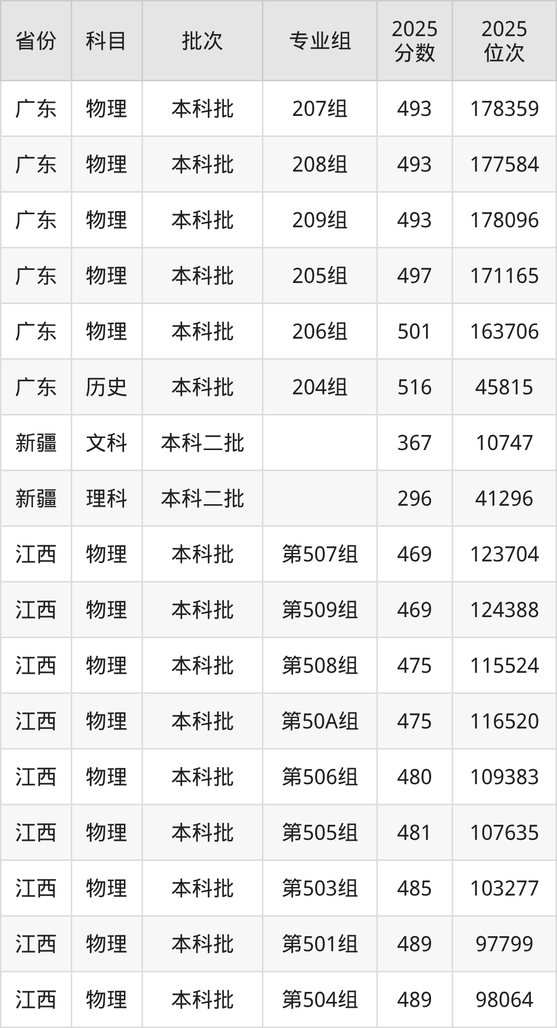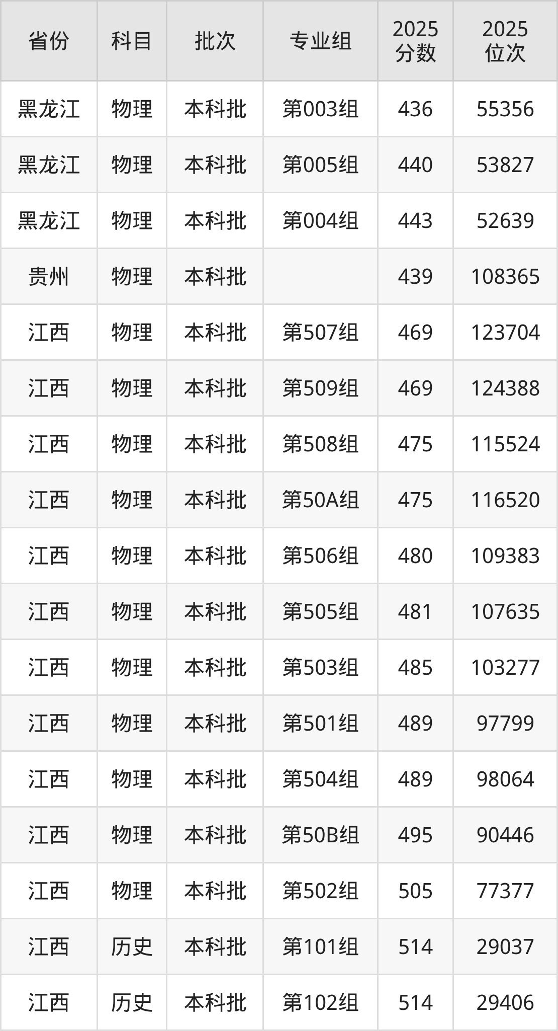 2025年在本科物理类进行招生,各专业组分数线详情如下: