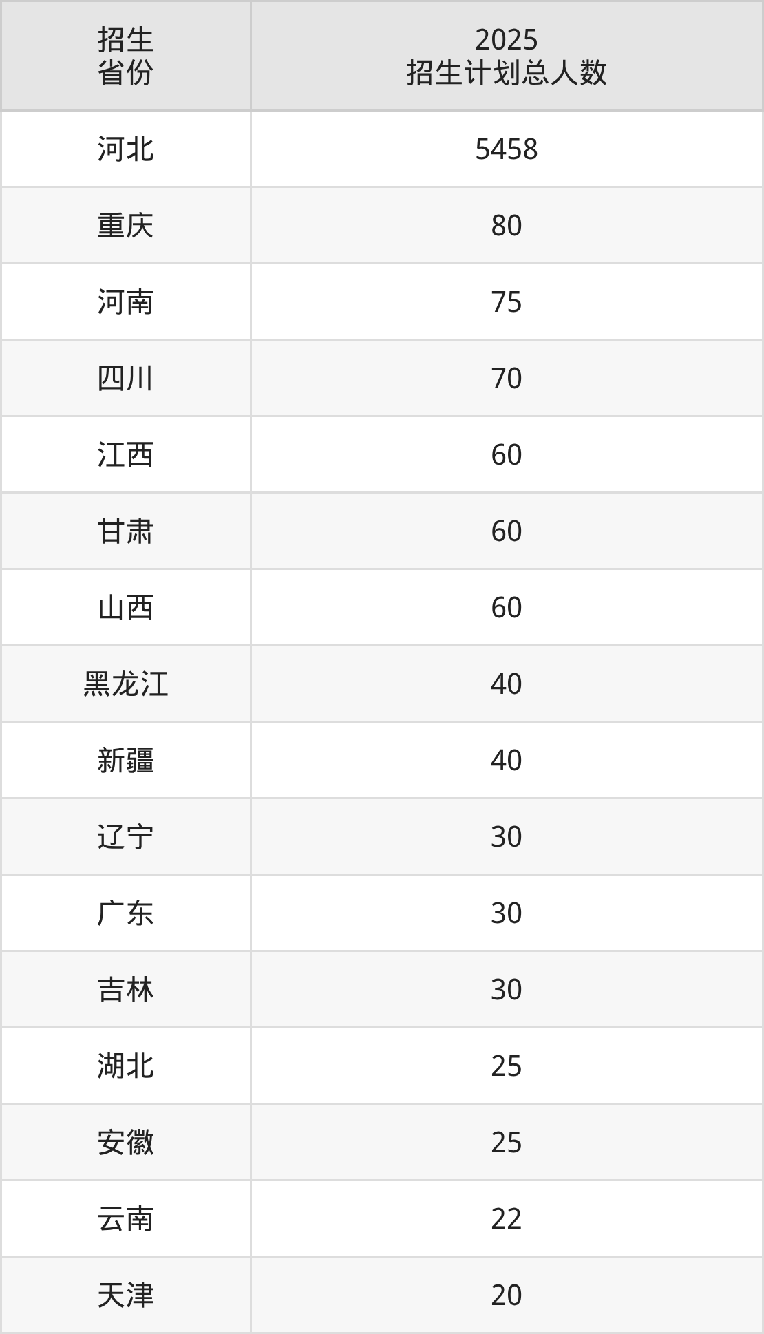 2025年河北工业职业技术大学面向全国22个省市开展本科招生;招生专业共35个,招生人数共3002人。2025年在河北省招生计划总人数是5458人,其中,河北工业职业技术大学在河北省招生人数最多的是软件技术。河北工业职业技术大学在各省具体招生人数情况如下表。