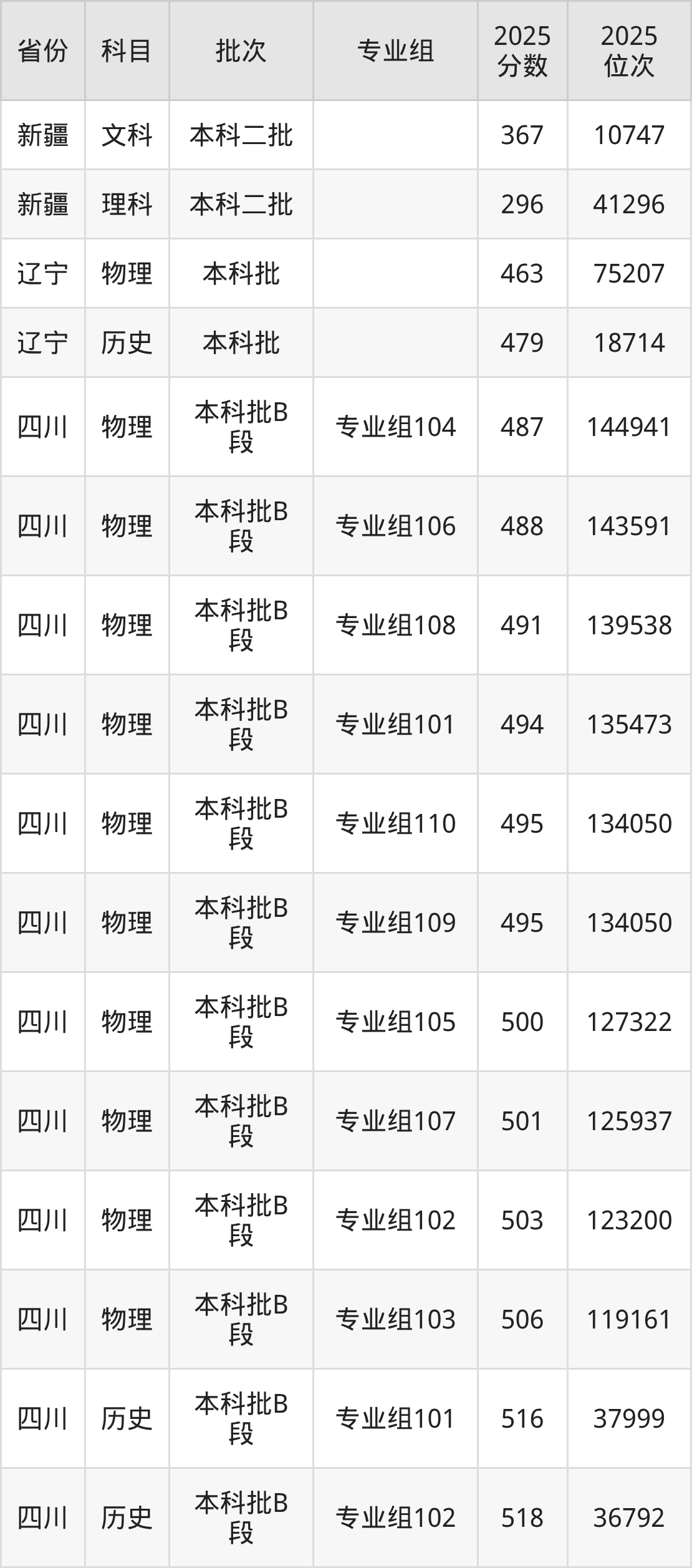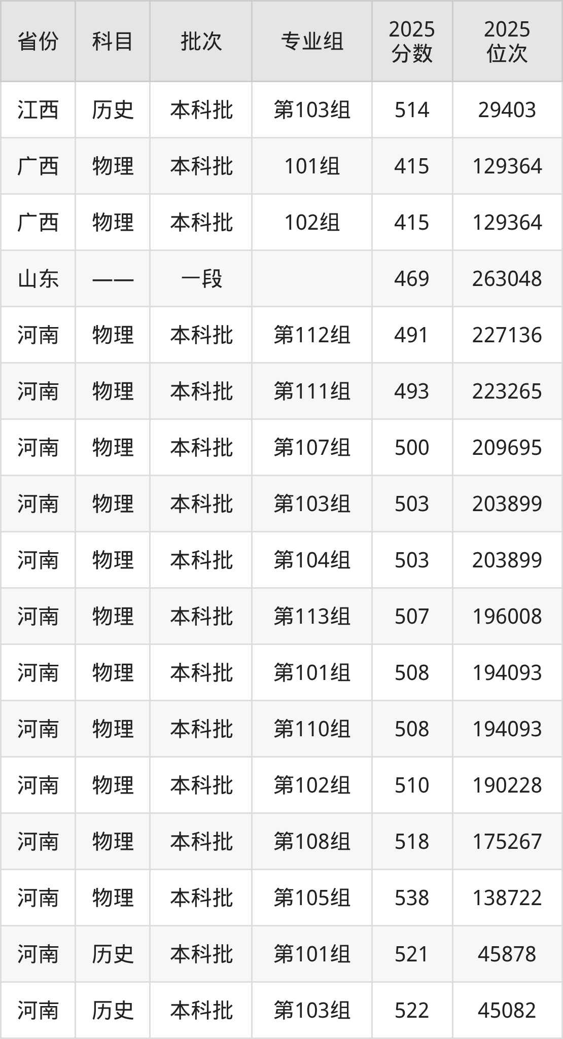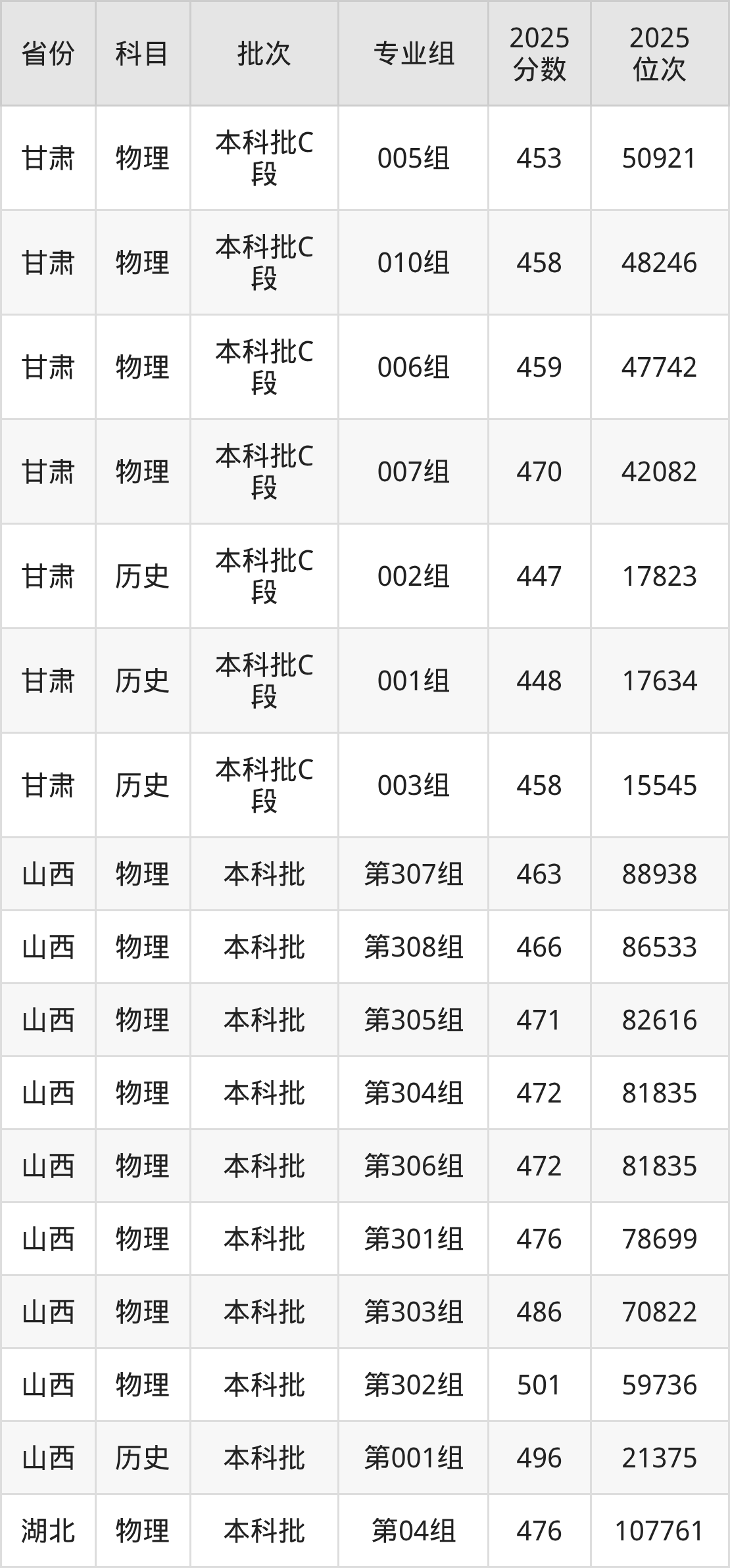 2025年投档录取最低分为463分,录取最低位次为75207名。