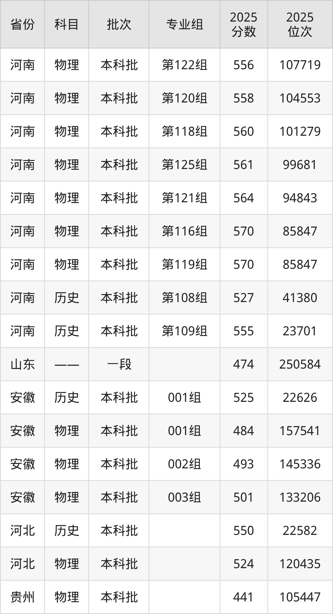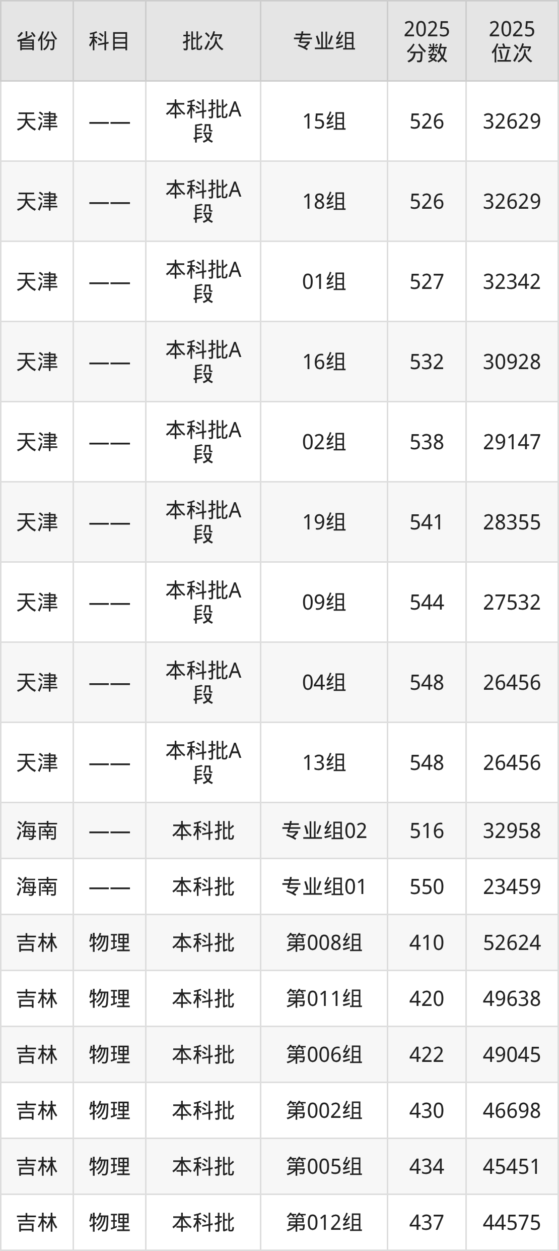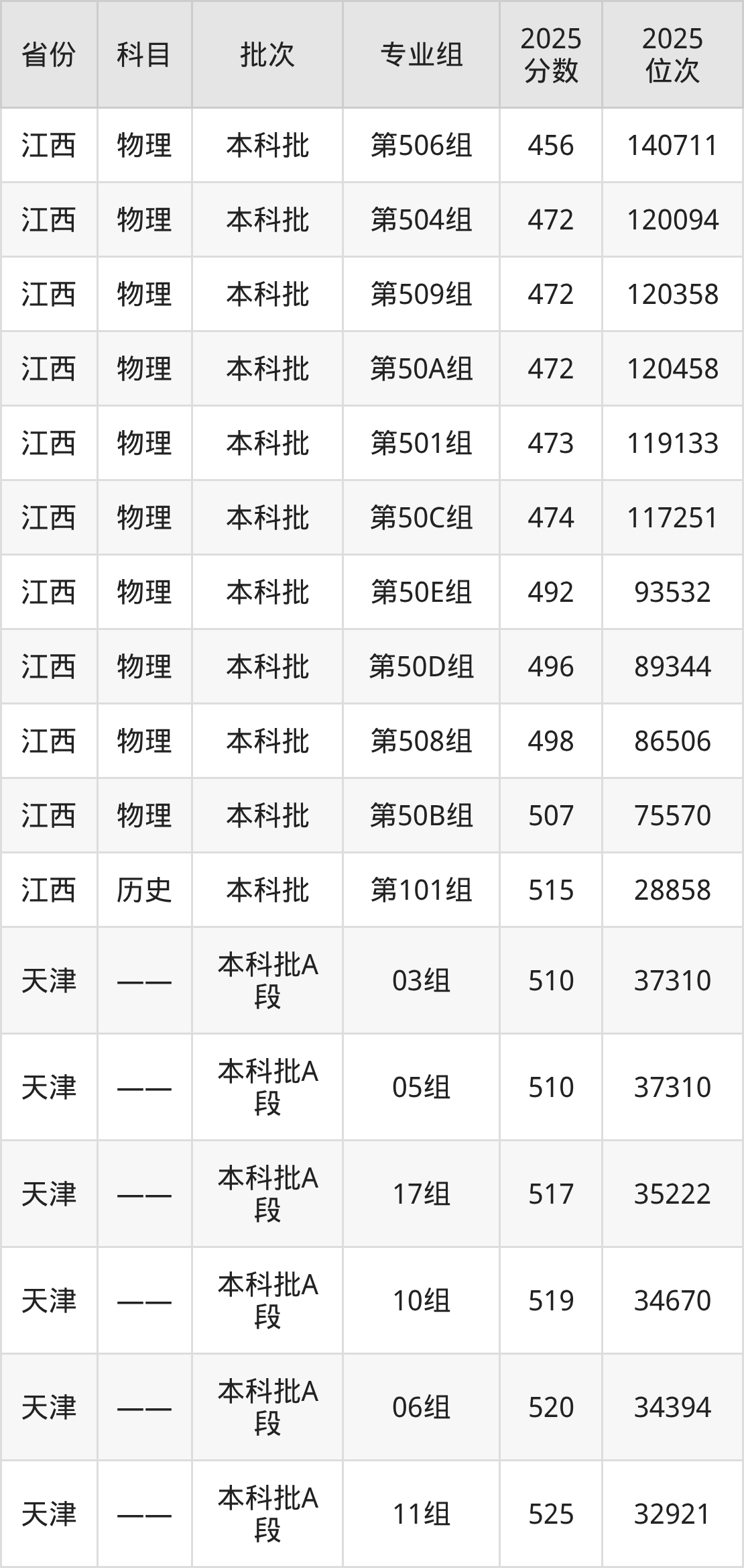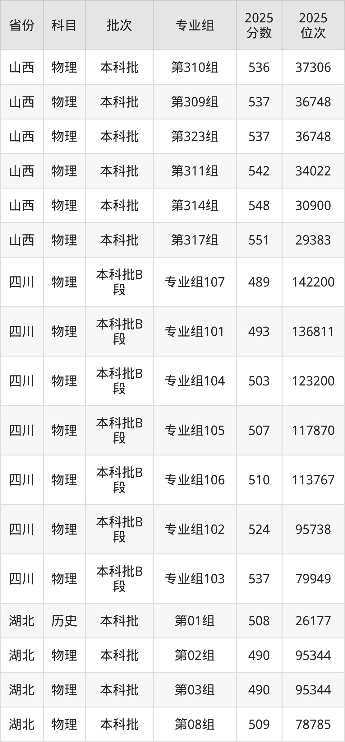 2025年在本科物理类进行招生,各专业组分数线详情如下: