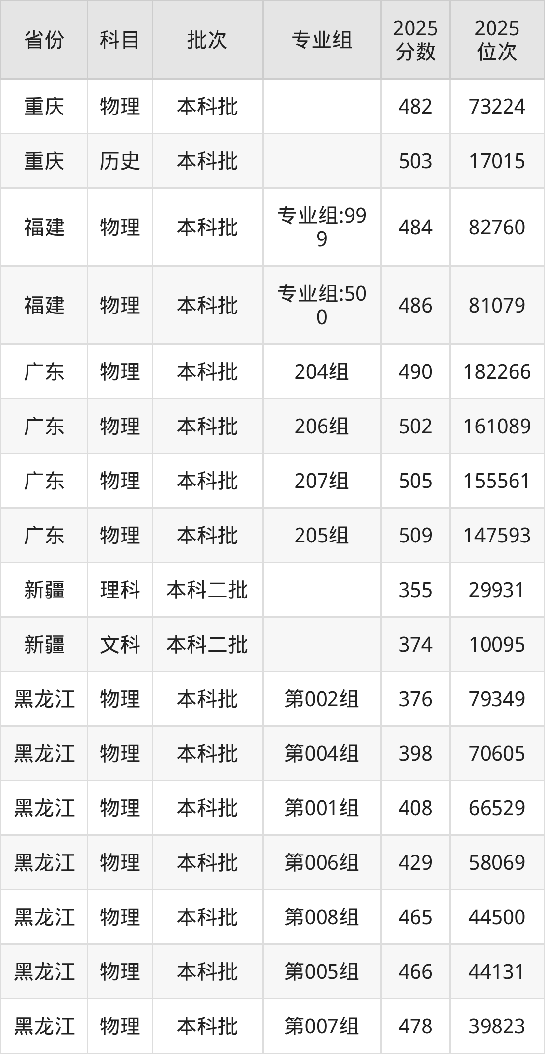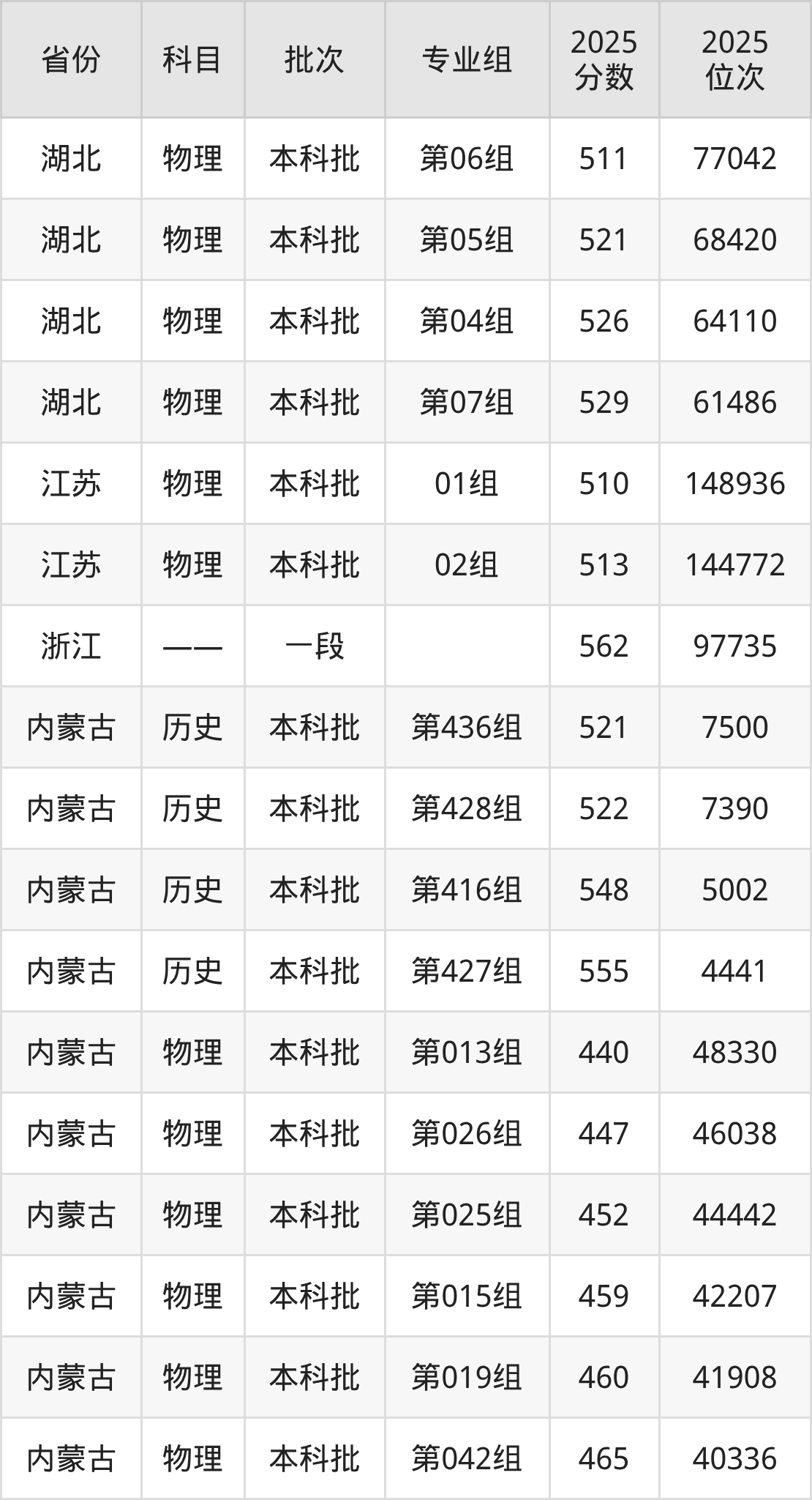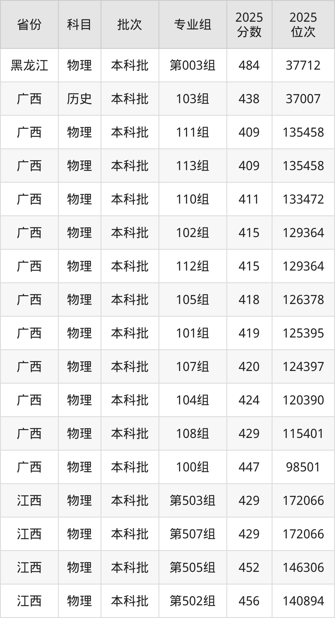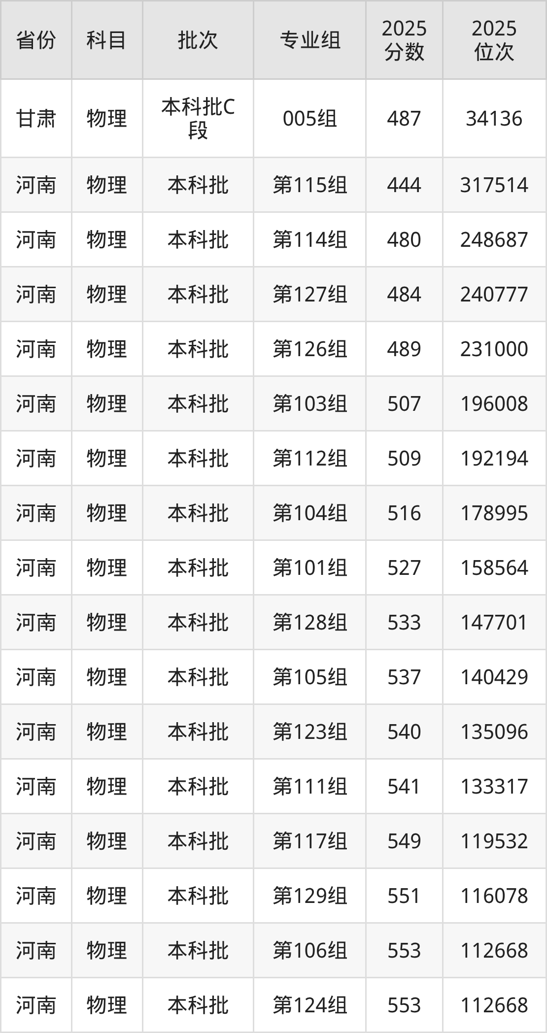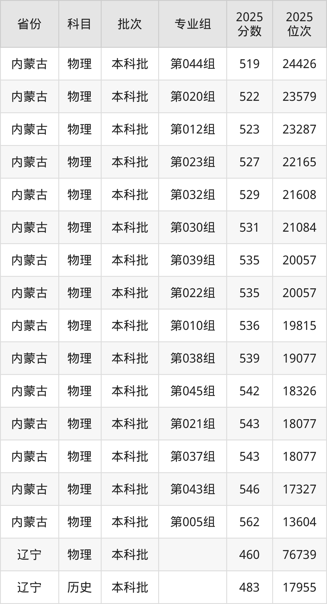2025年在本科物理类进行招生,各专业组分数线详情如下: