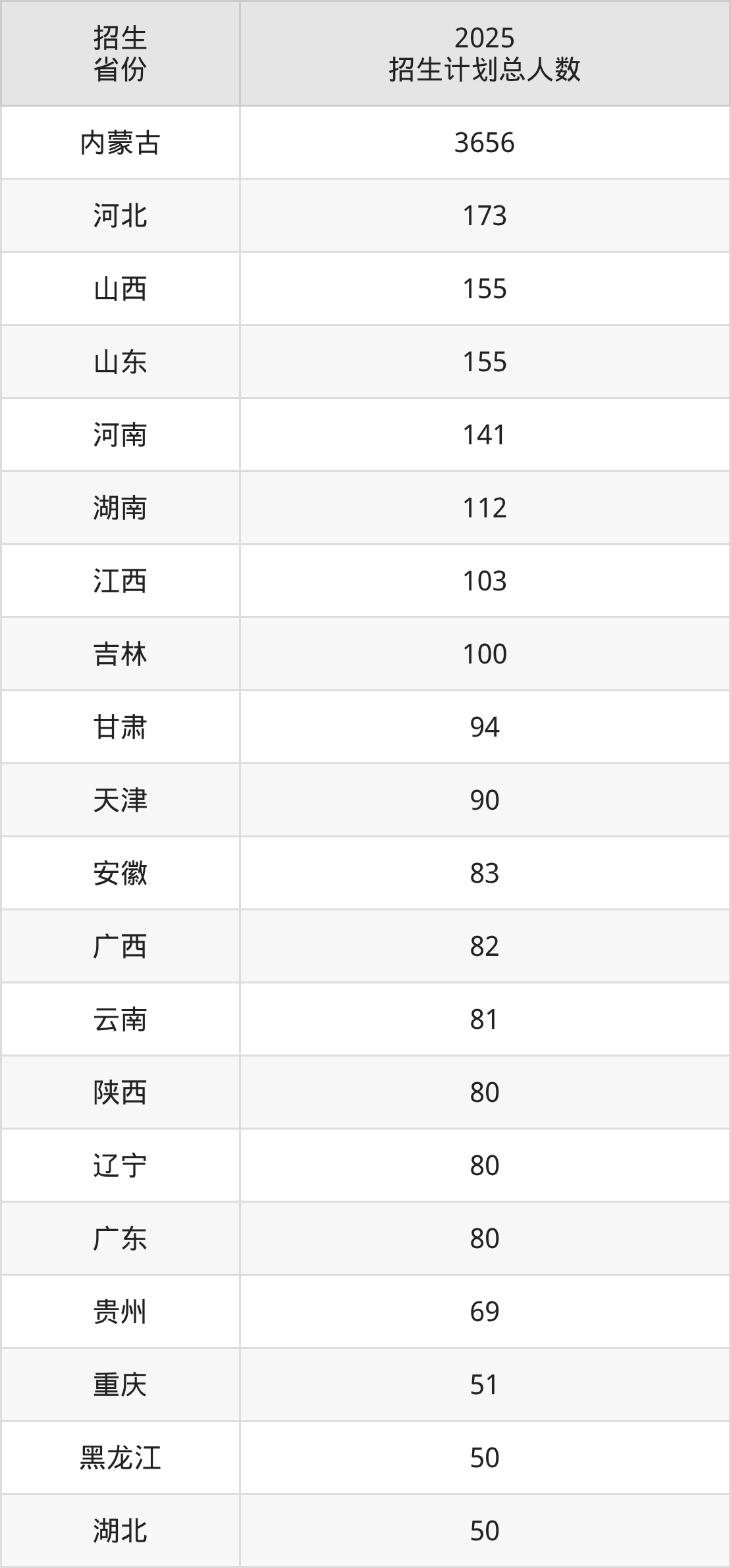 2025年内蒙古工业大学面向全国27个省市开展本科招生;招生专业共63个,招生人数共5640人。2025年在内蒙古自治区招生计划总人数是3656人,其中,内蒙古工业大学在内蒙古自治区招生人数最多的是电气工程及其自动化。内蒙古工业大学在各省具体招生人数情况如下表。