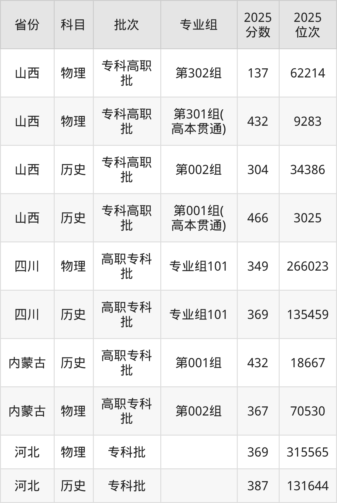 山西金融职业学院第001组(高本贯通):2025年投档录取最低分为466分,录取最低位次为3025名。
