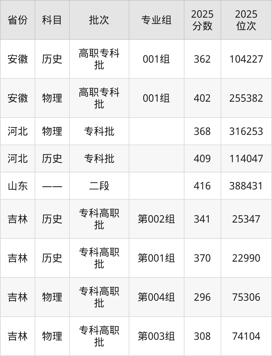 吉林交通职业技术学院第001组:2025年投档录取最低分为370分,录取最低位次为22990名。