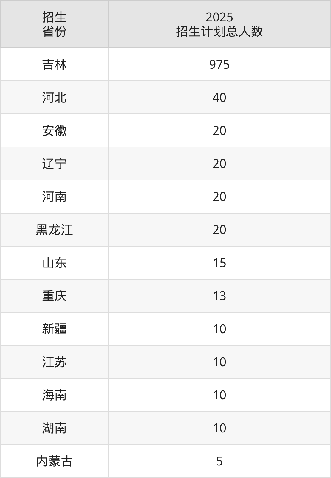 2025年吉林交通职业技术学院面向全国13个省市开展专科招生;招生专业共26个,招生人数共1168人。2025年在吉林省招生计划总人数是975人,其中,吉林交通职业技术学院在吉林省招生人数最多的是道路与桥梁工程技术。吉林交通职业技术学院在各省具体招生人数情况如下表。