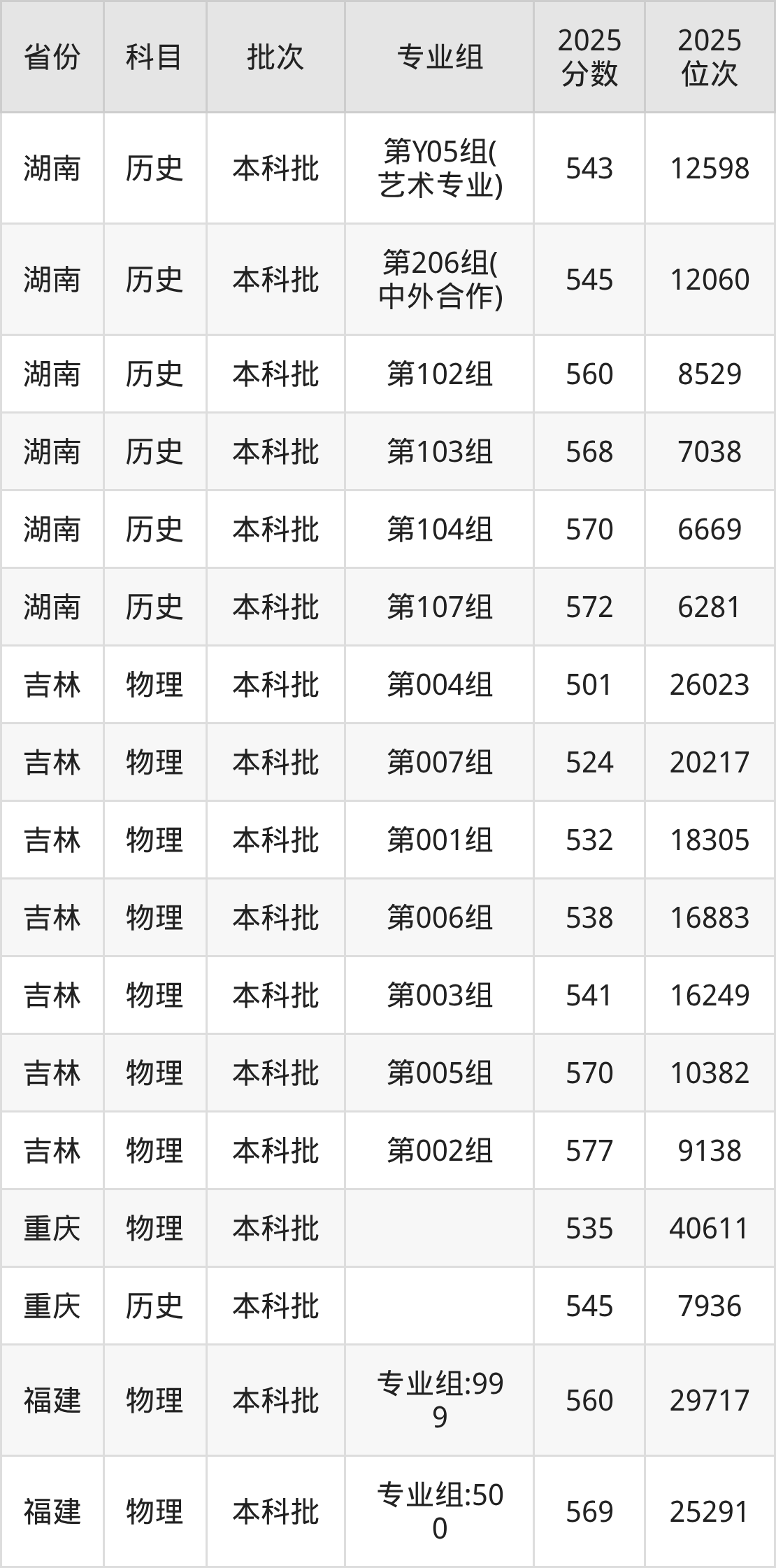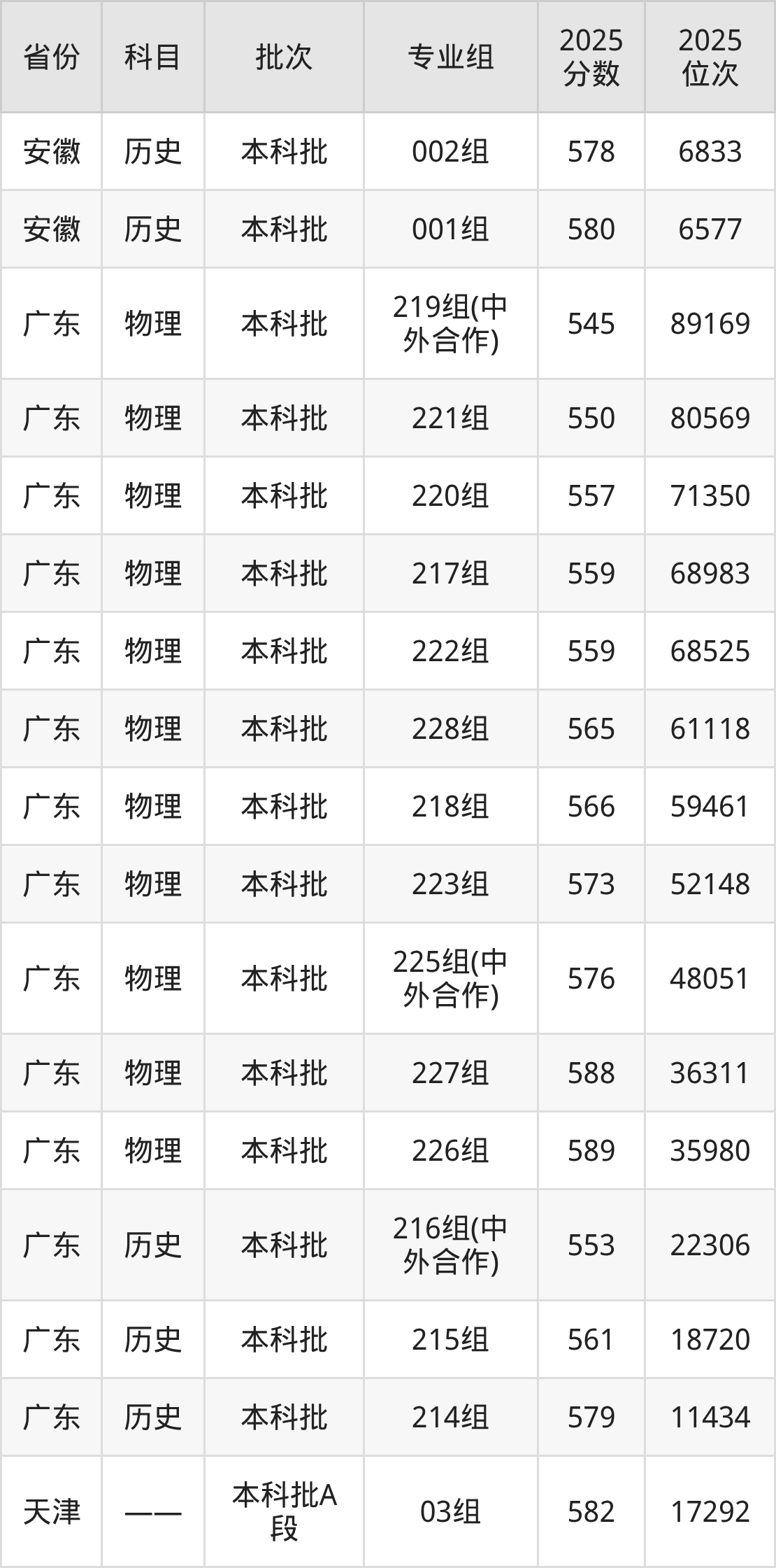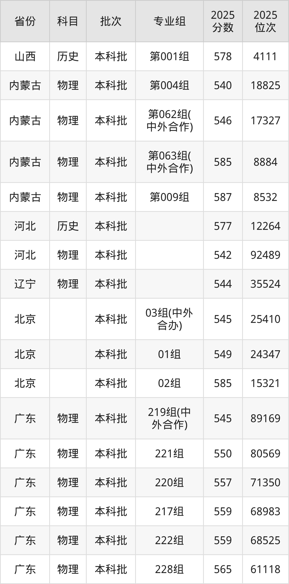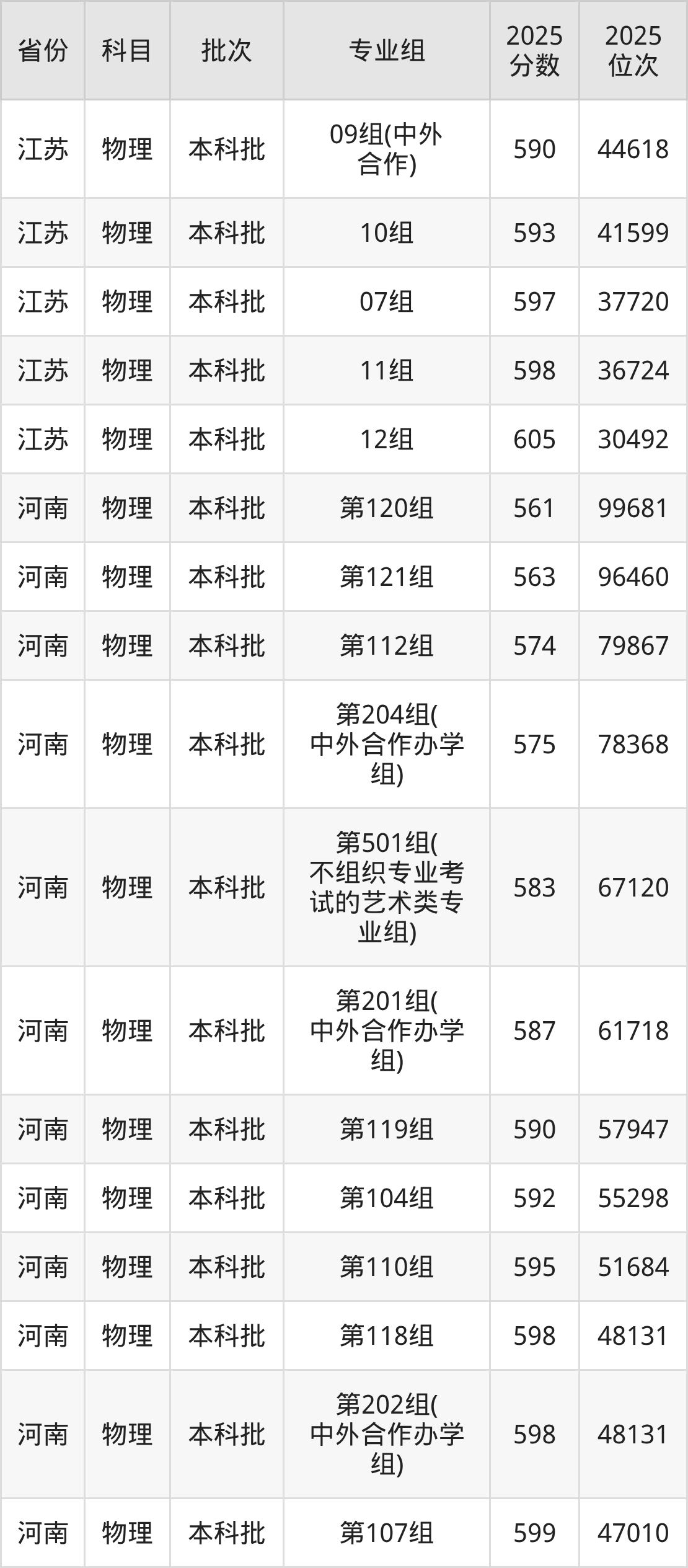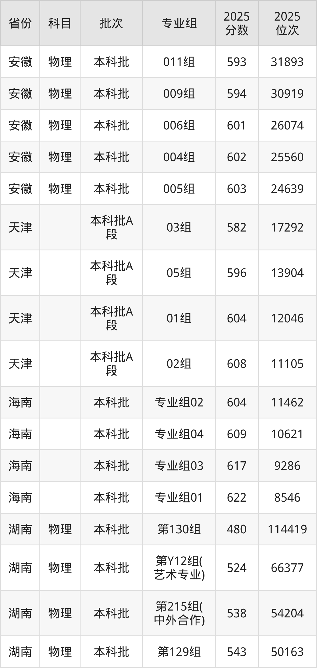 2025年在本科物理类进行招生,各专业组分数线详情如下: