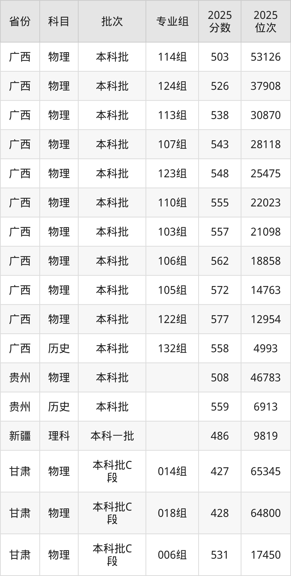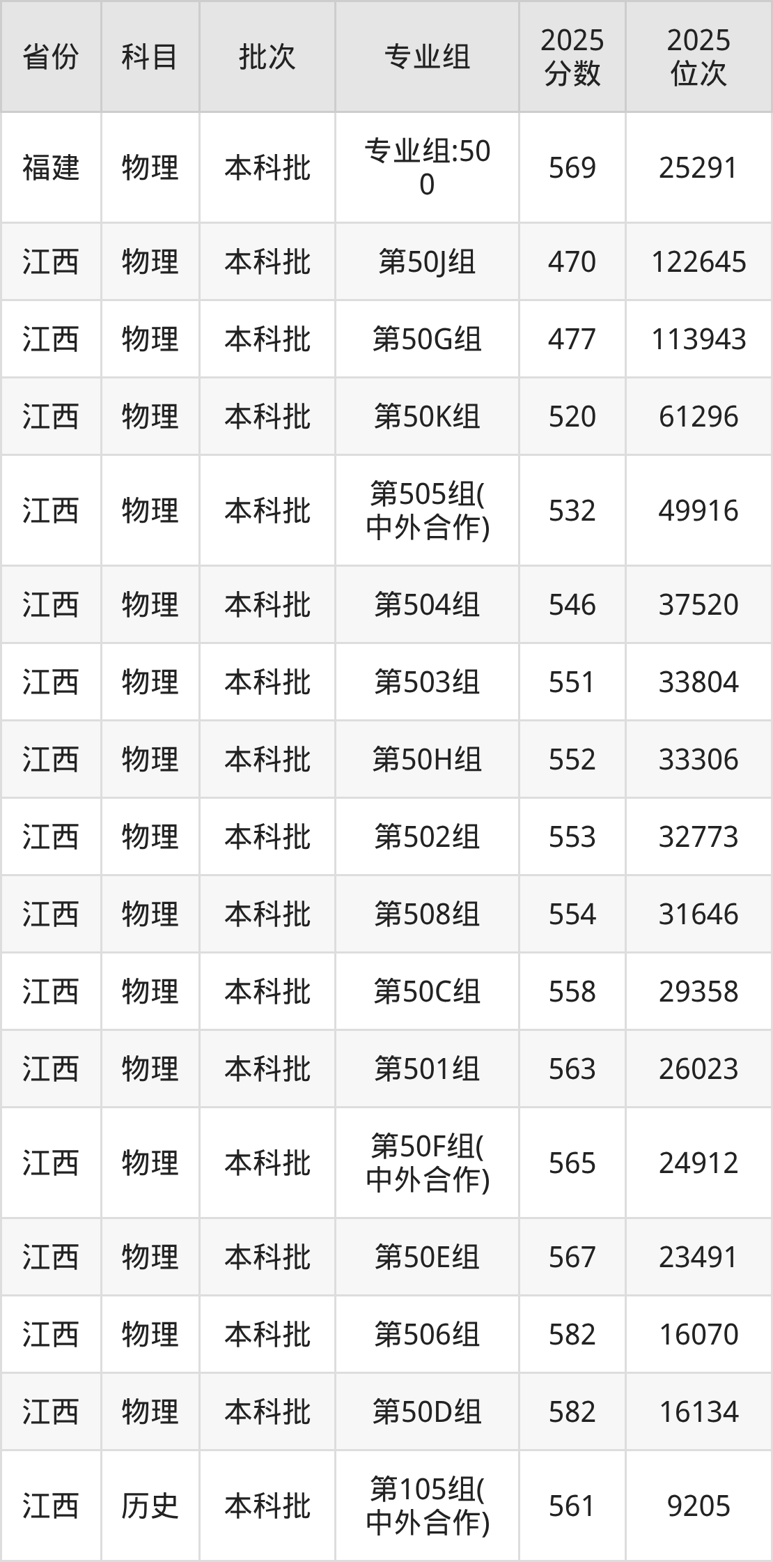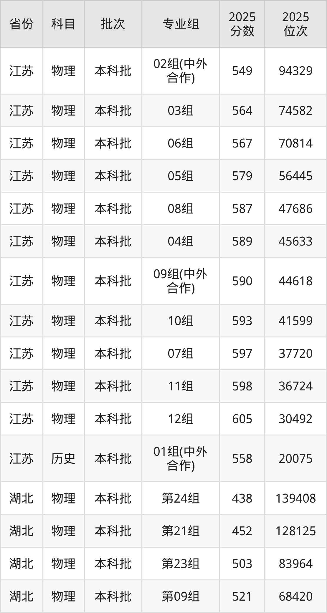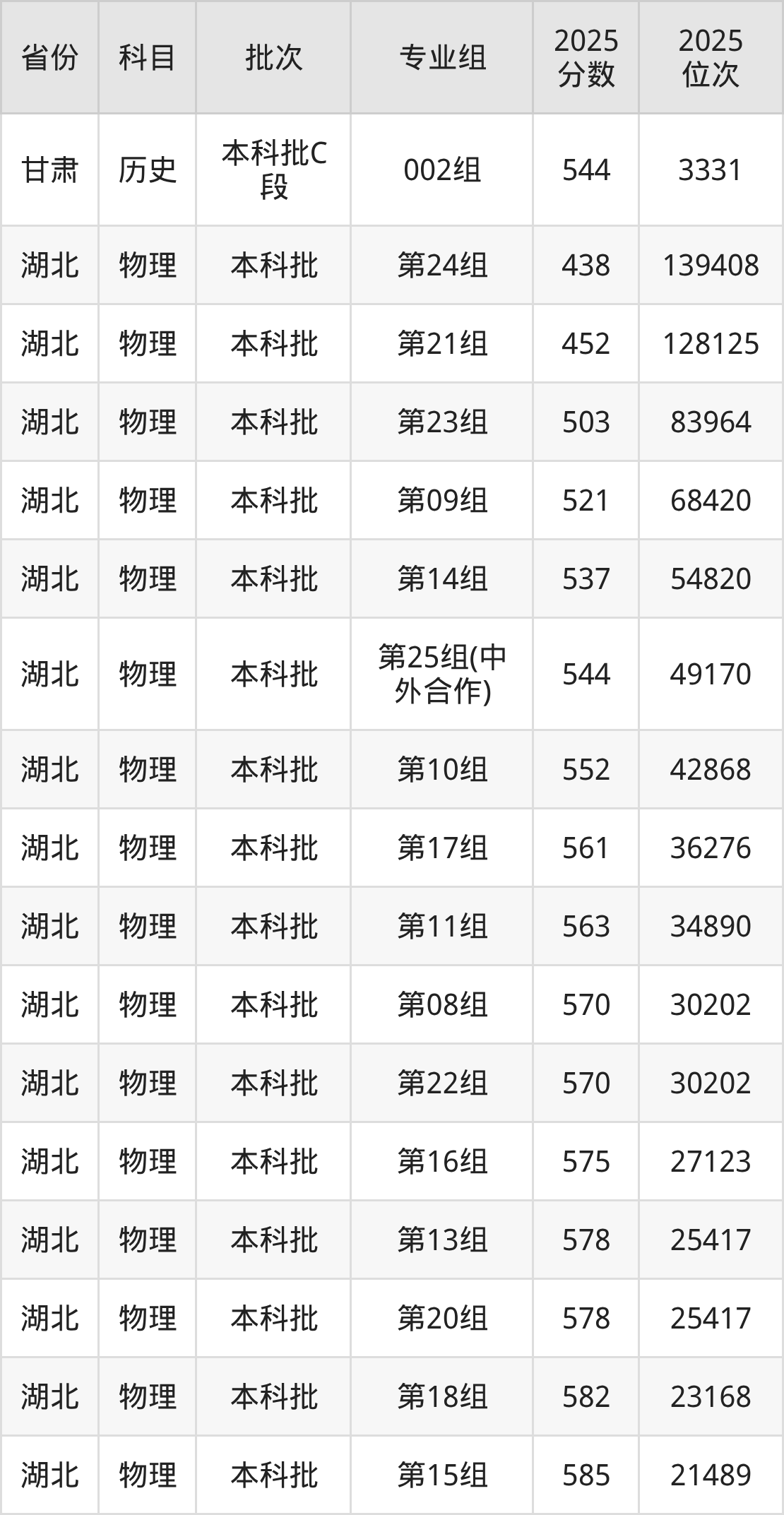 2025年在本科物理类进行招生,各专业组分数线详情如下: