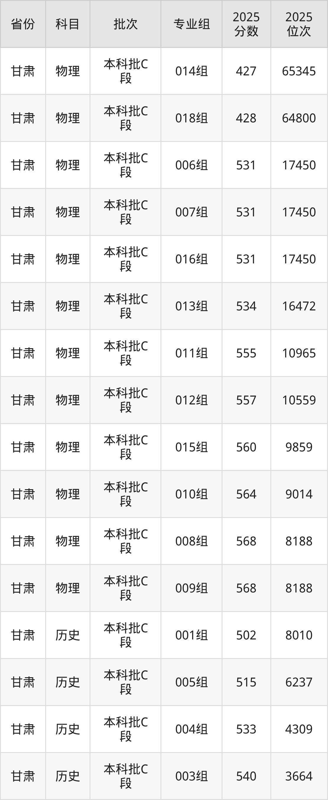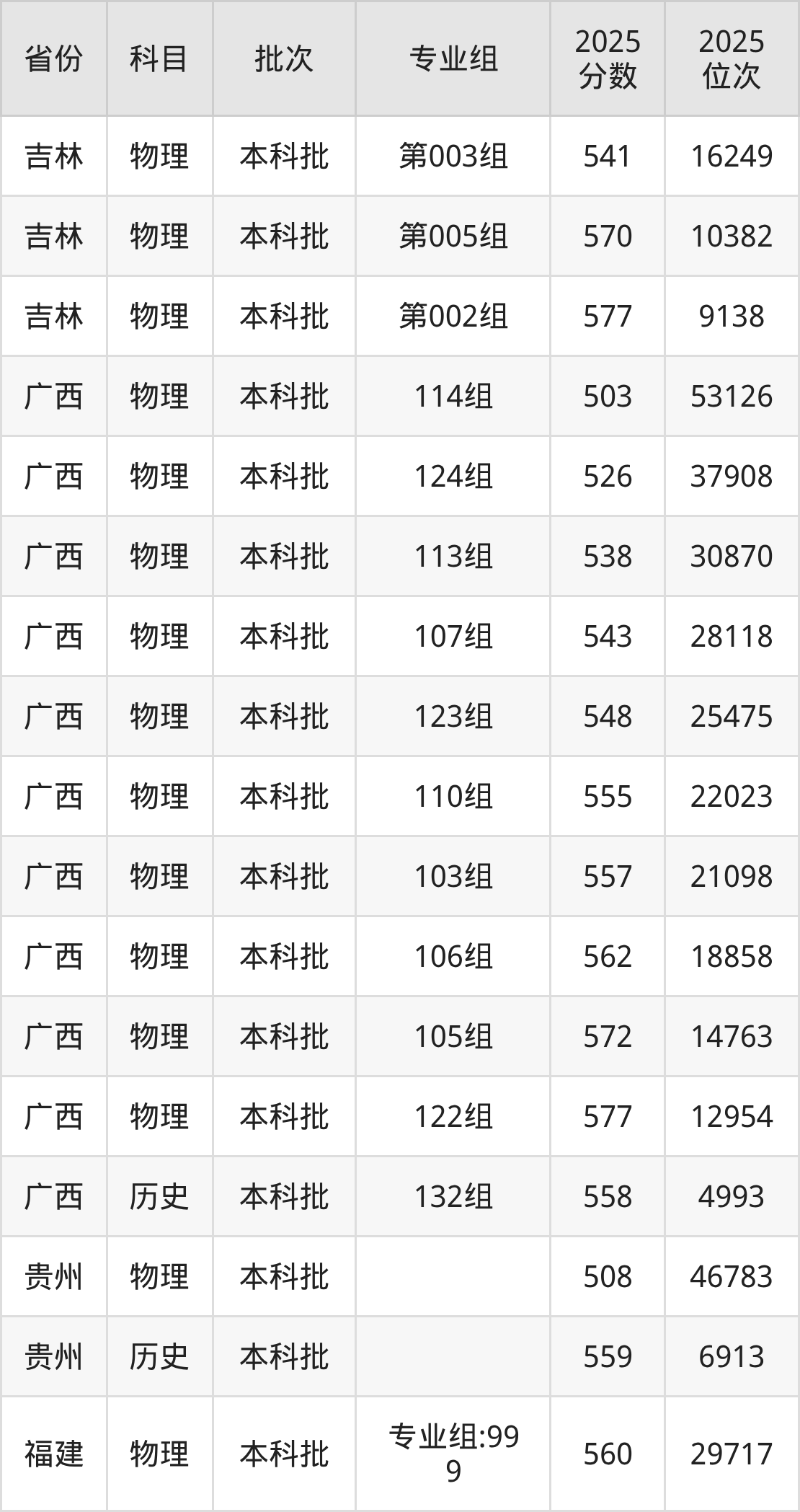 普通类本科物理类最低542分,本科历史类最低577分