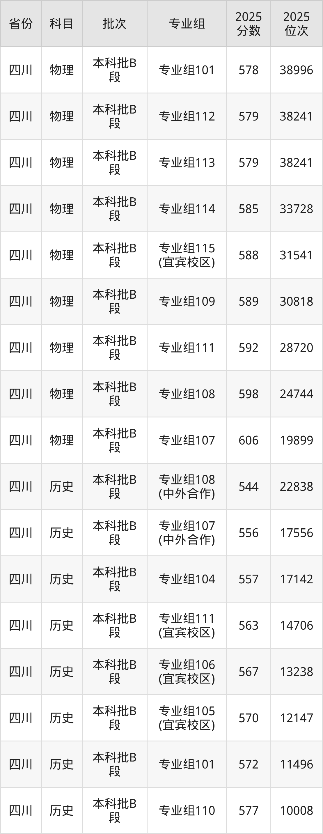 成都理工大学专业组111(宜宾校区):2025年投档录取最低分为563分,录取最低位次为14706名。