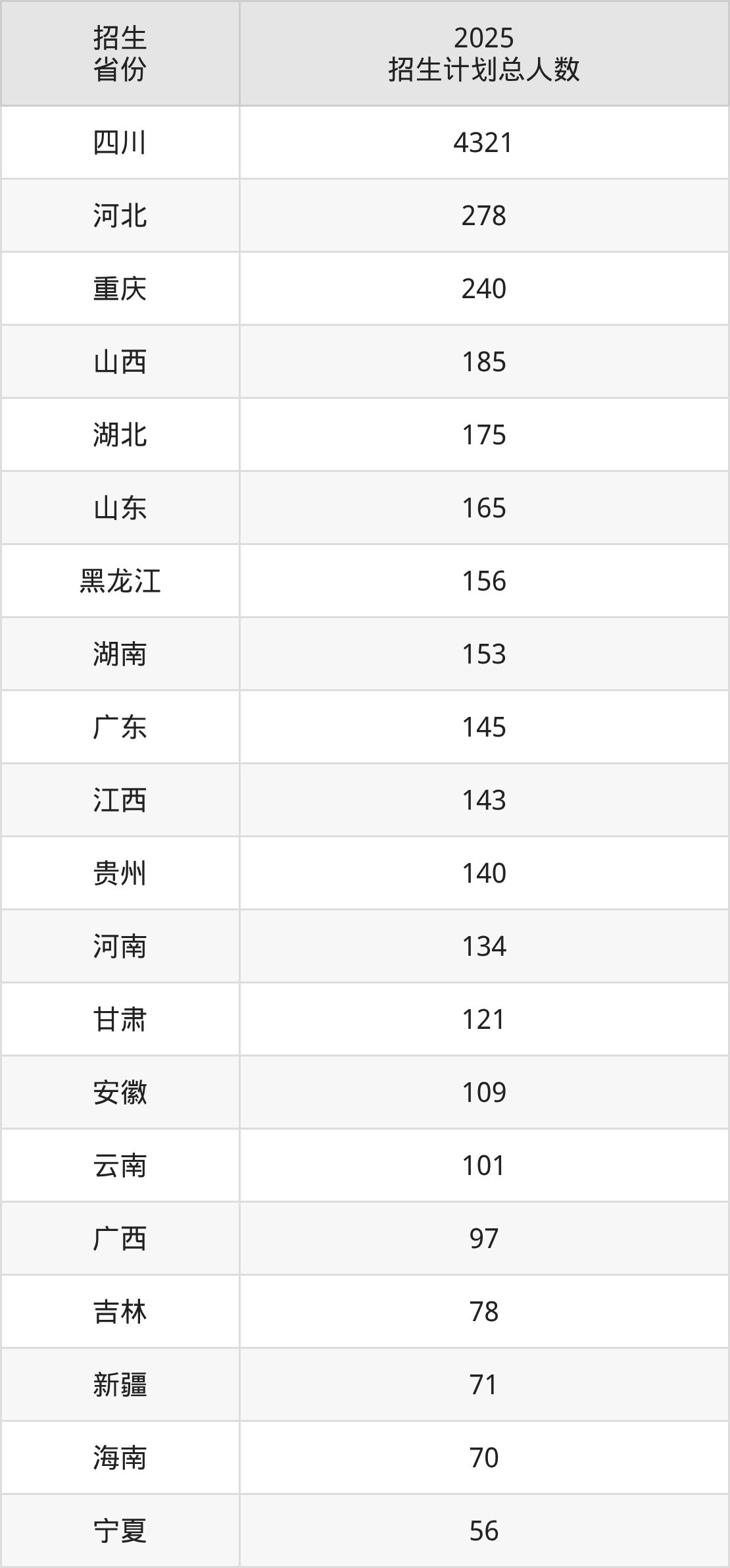 2025年成都理工大学面向全国29个省市开展本科招生;招生专业共67个,招生人数共7211人。2025年在四川省招生计划总人数是4321人,其中,成都理工大学在四川省招生人数最多的是物联网工程。成都理工大学在各省具体招生人数情况如下表。