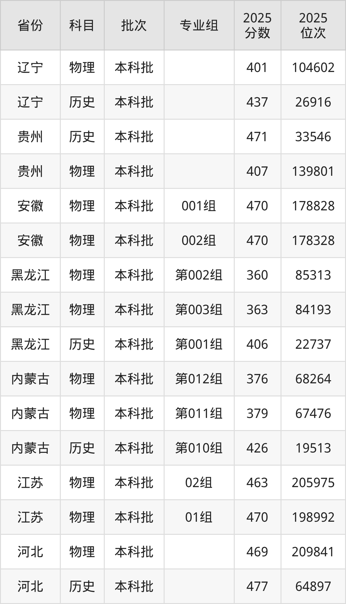 2025年在本科物理类进行招生,各专业组分数线详情如下: