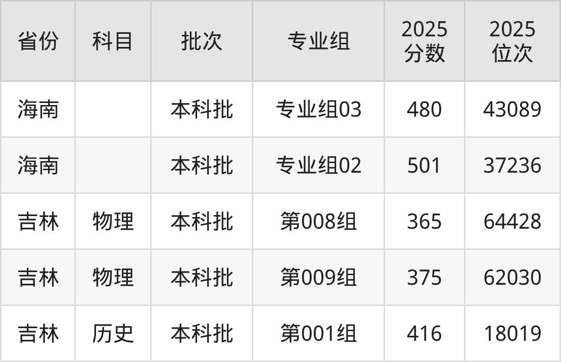 2025年吉林动画学院全国录取分数线是360分到501分,录取最低在黑龙江物理类(第002组)、录取最高在海南(专业组02)。各省各专业组最低分具有差异,详情如下:
