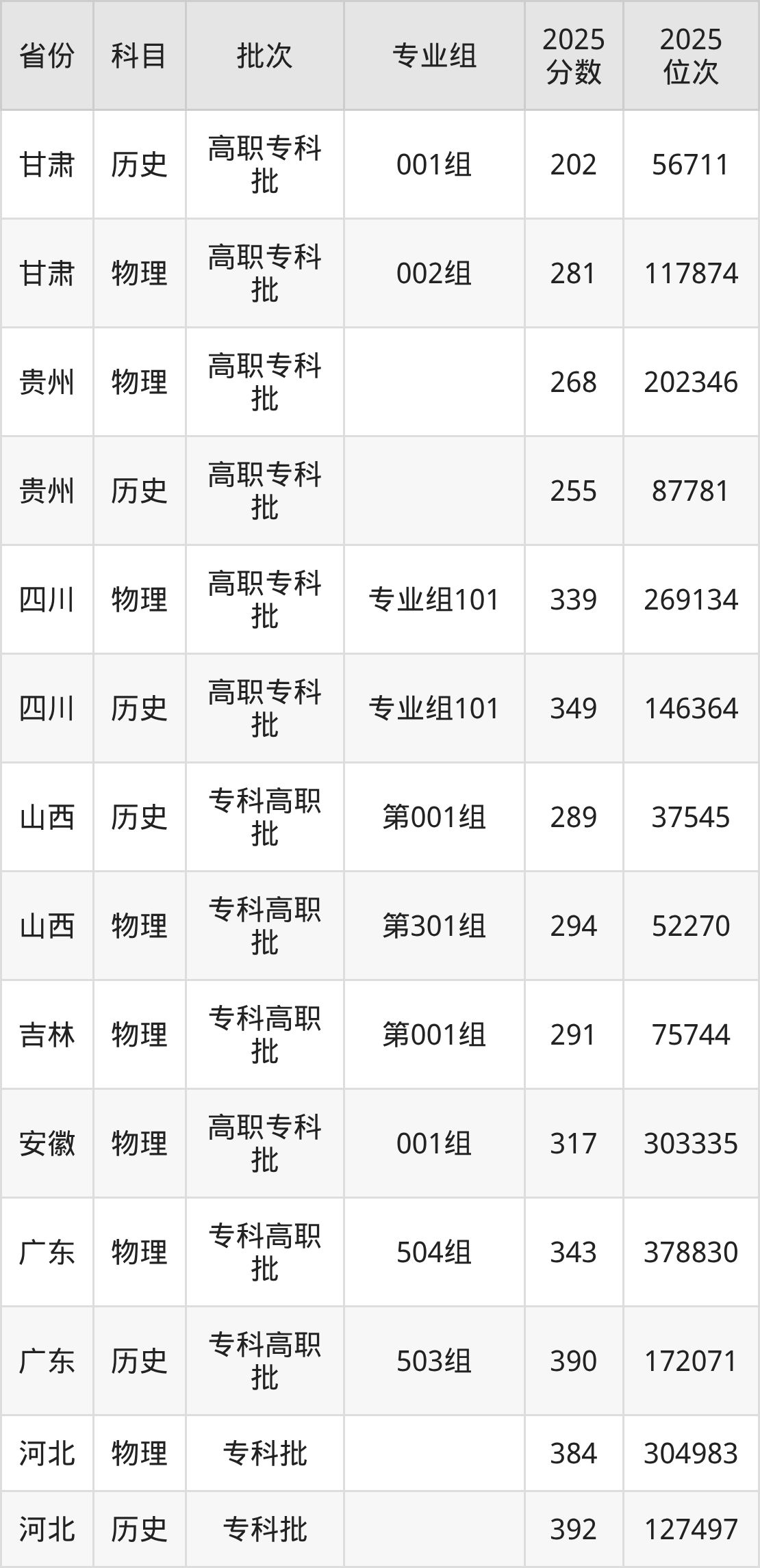 2025年在专科物理类进行招生,各专业组分数线详情如下: