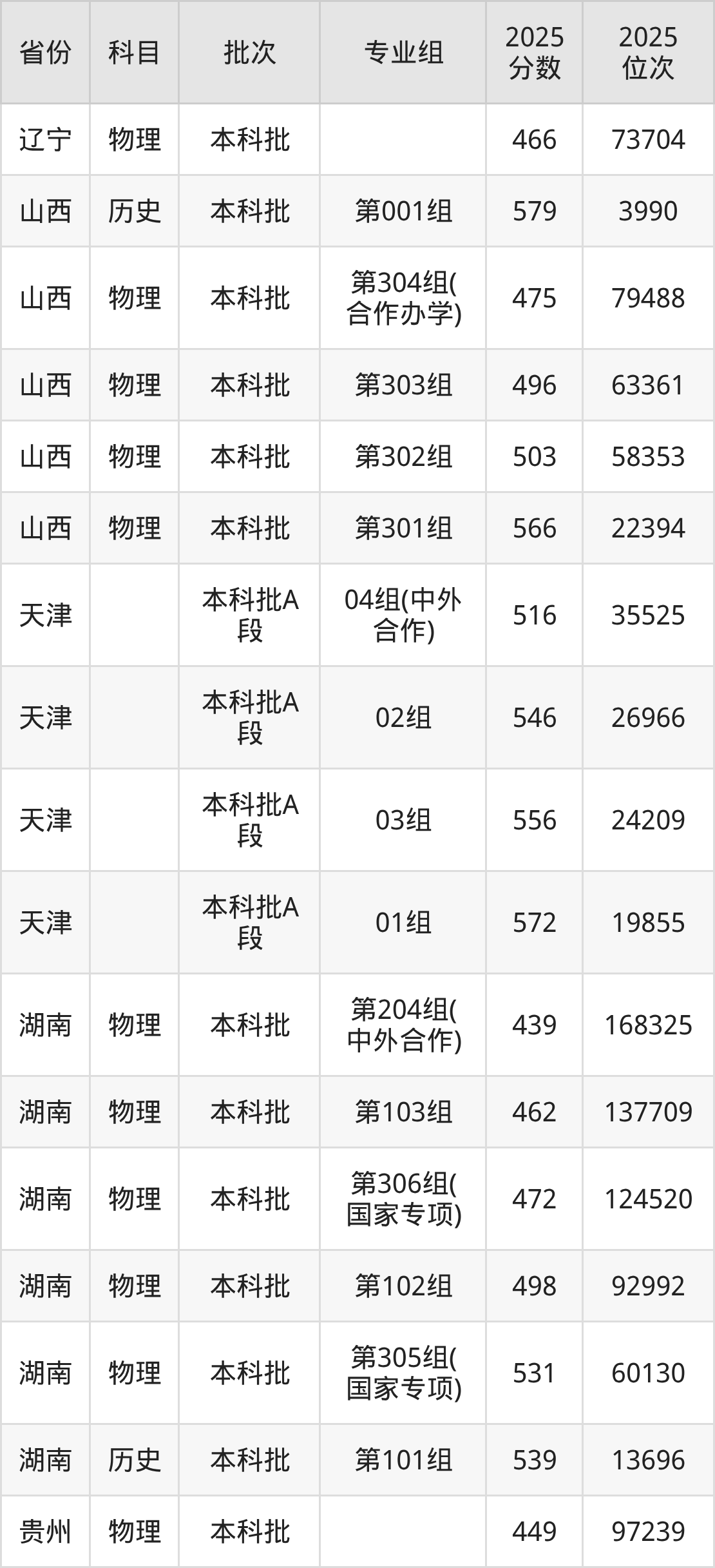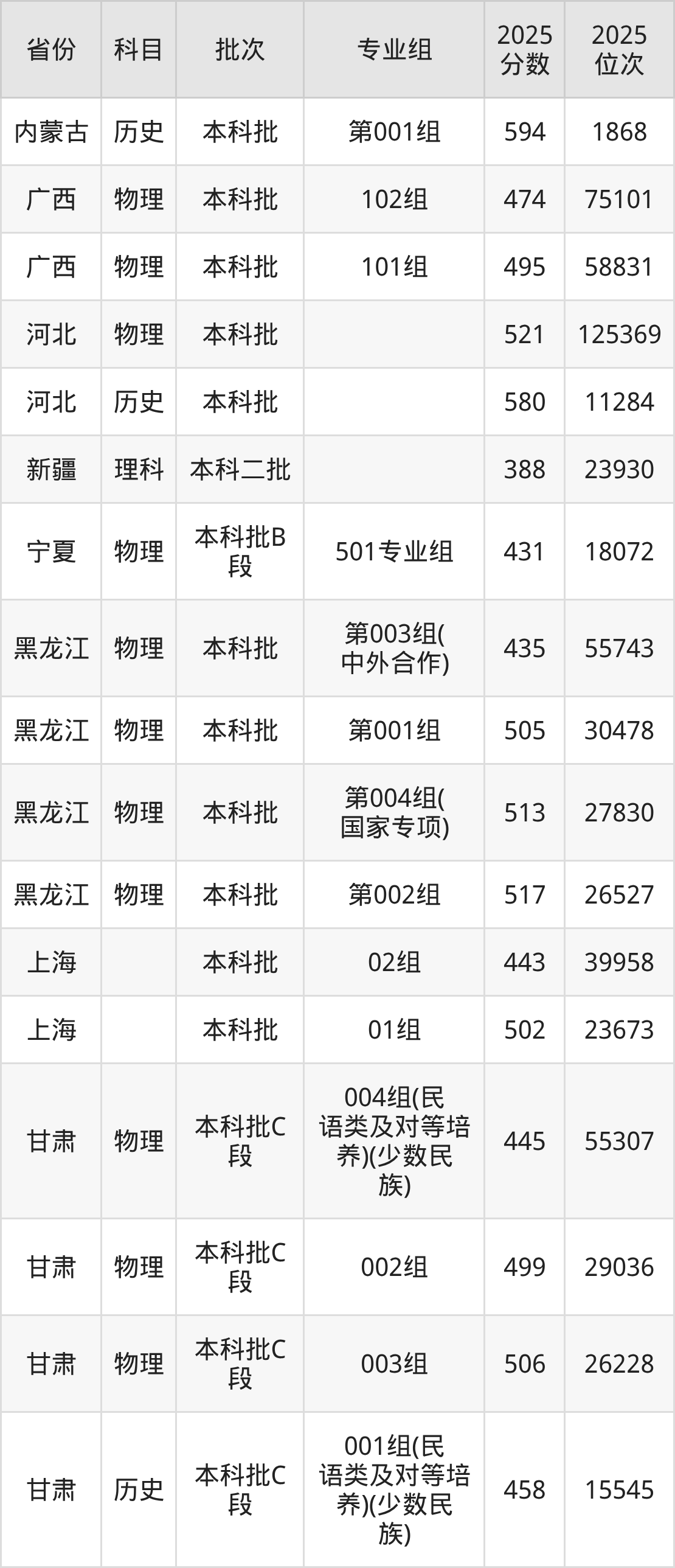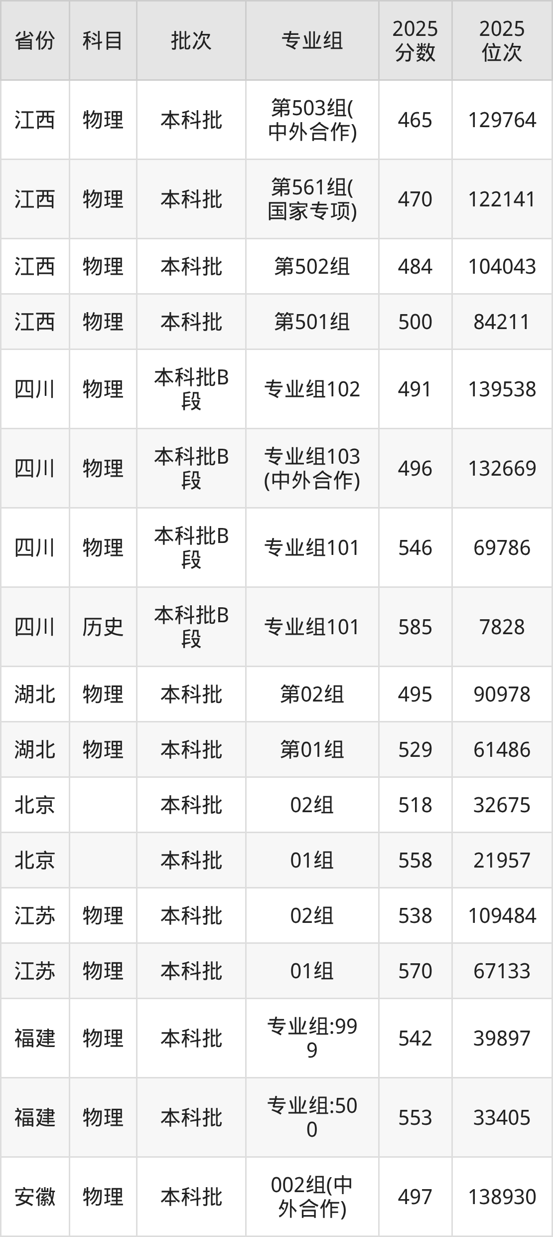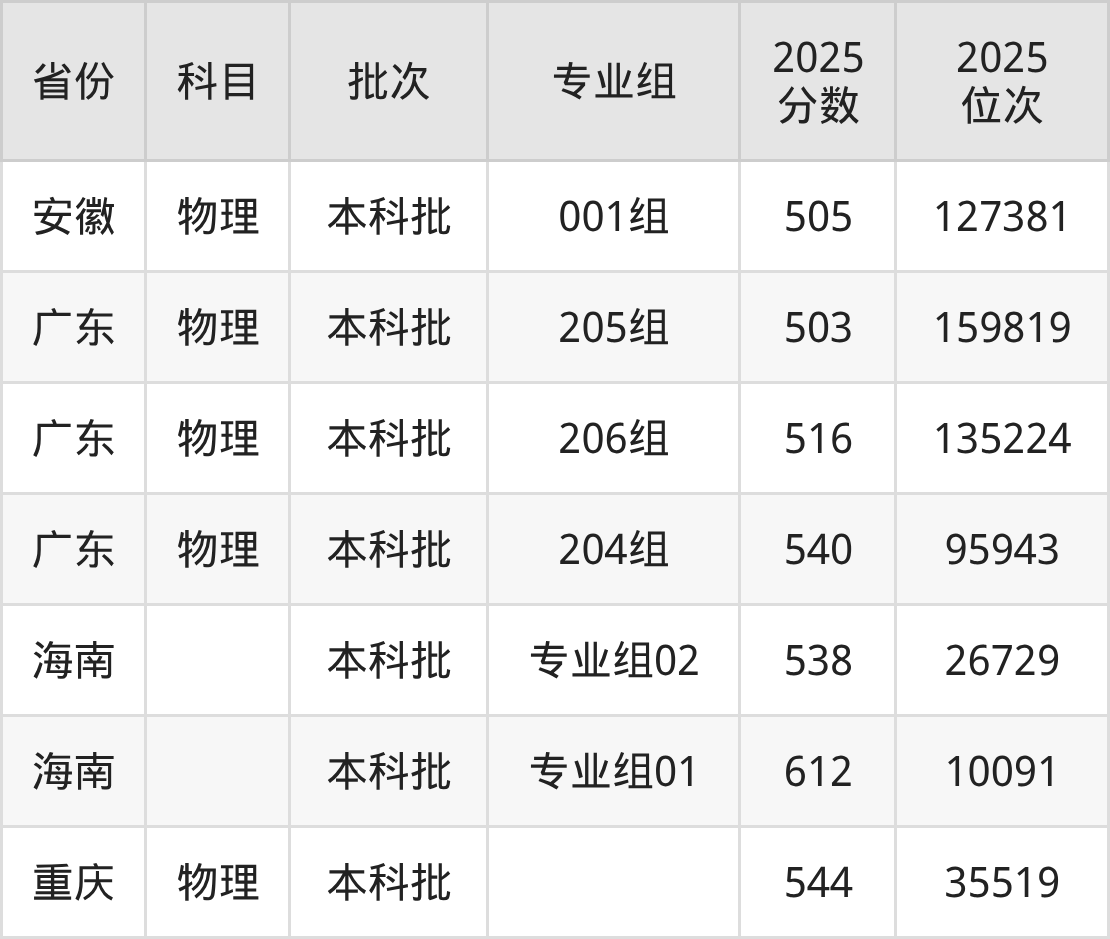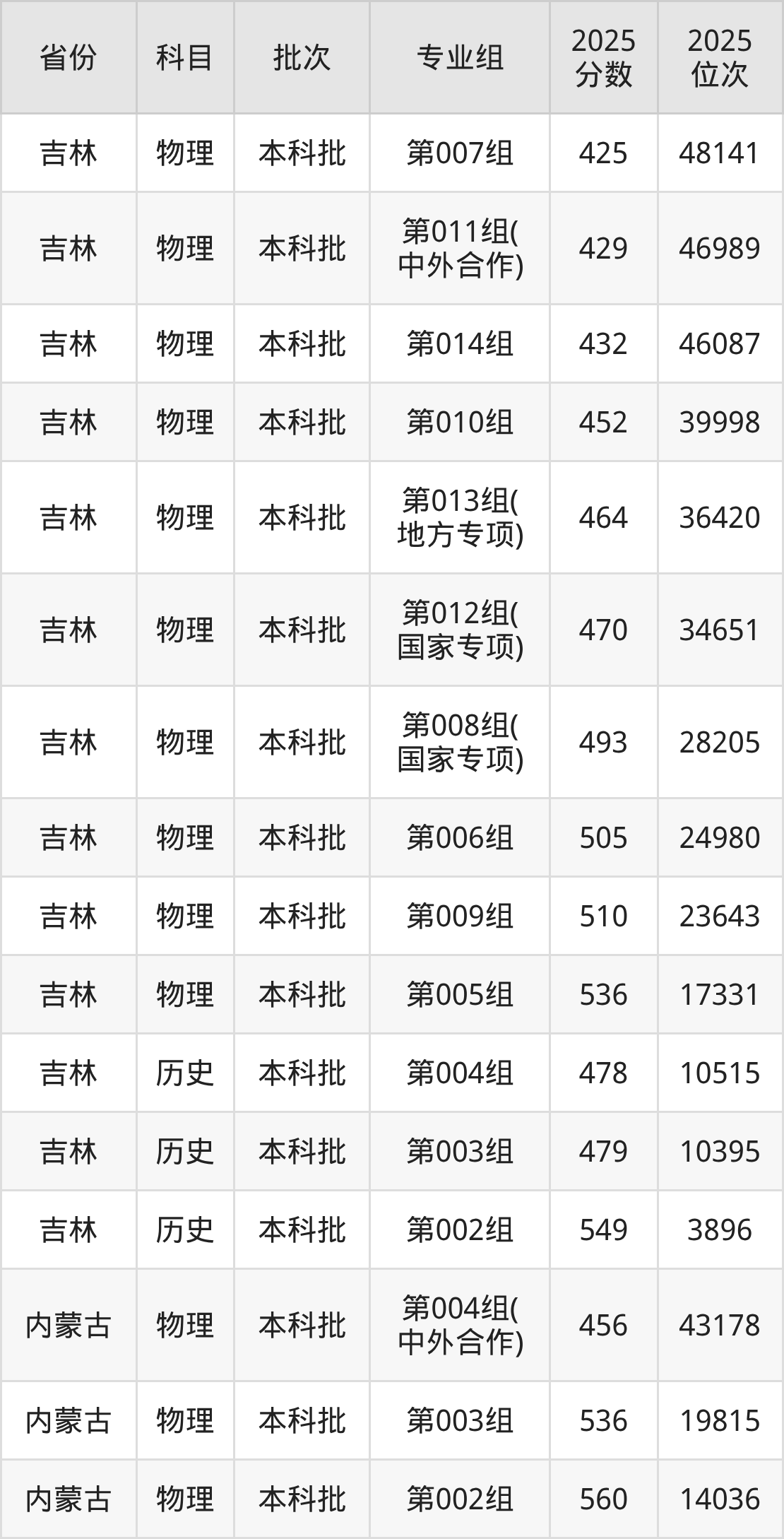 2025年在本科物理类进行招生,各专业组分数线详情如下: