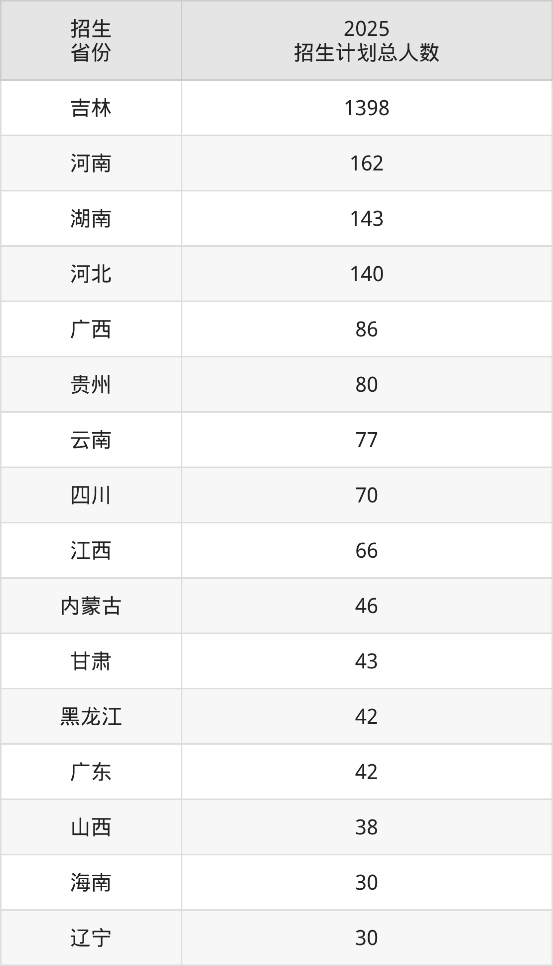 2025年长春中医药大学面向全国28个省市开展本科招生;招生专业共22个,招生人数共2620人。2025年在吉林省招生计划总人数是1398人,其中,长春中医药大学在吉林省招生人数最多的是护理学。长春中医药大学在各省具体招生人数情况如下表。