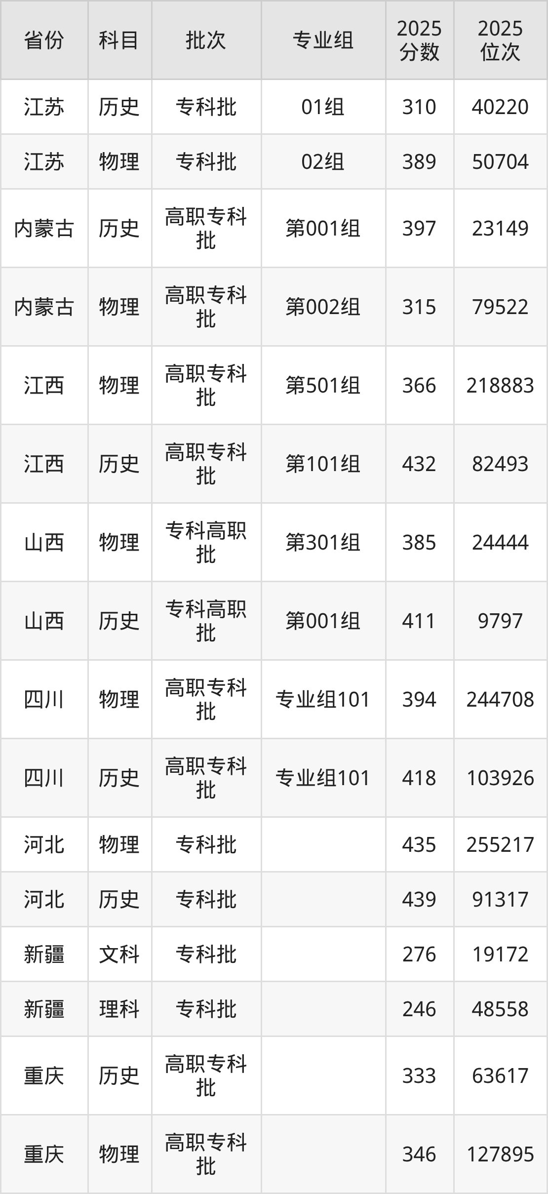 普通类专科历史类最低310分,专科物理类最低389分