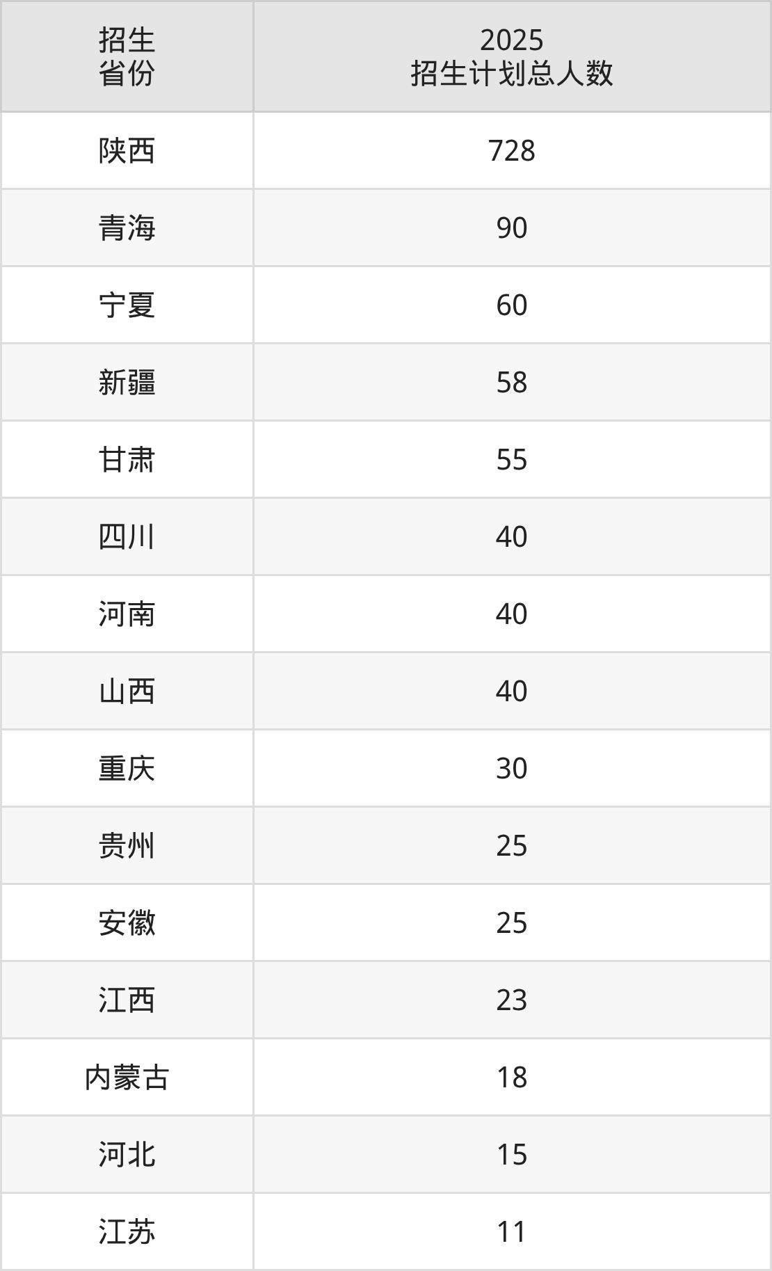 2025年陕西能源职业技术学院面向全国15个省市开展专科招生;招生专业共47个,招生人数共1258人。2025年在陕西省招生计划总人数是728人,其中,陕西能源职业技术学院在陕西省招生人数最多的是针灸推拿。陕西能源职业技术学院在各省具体招生人数情况如下表。