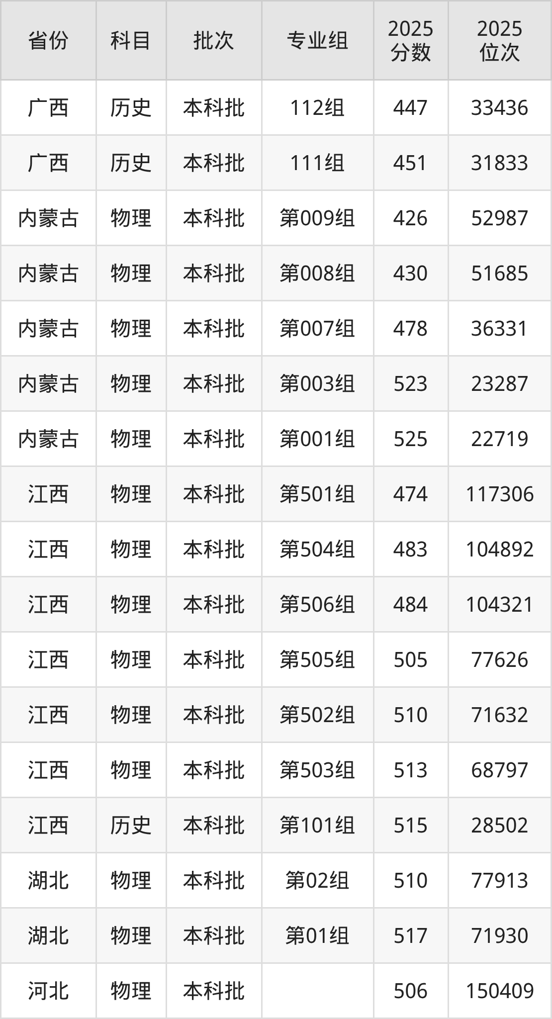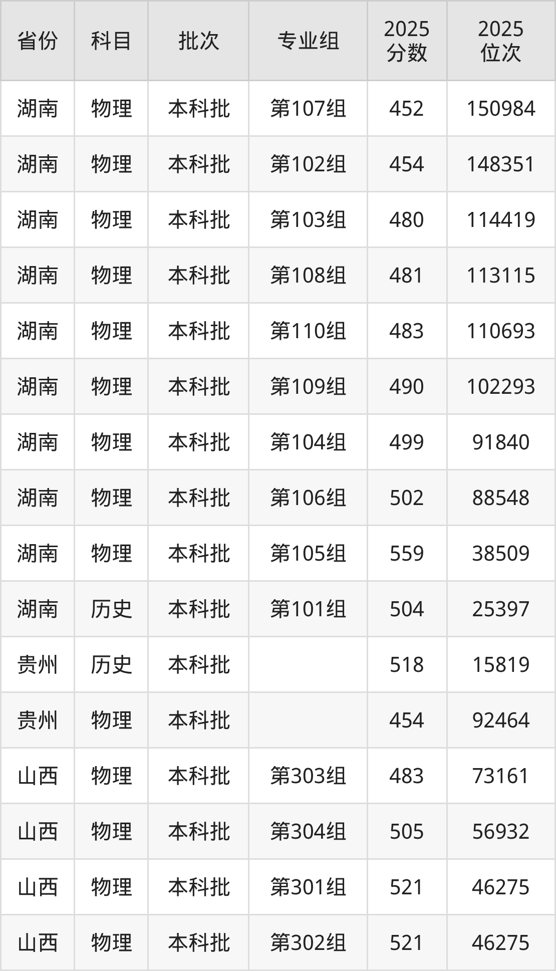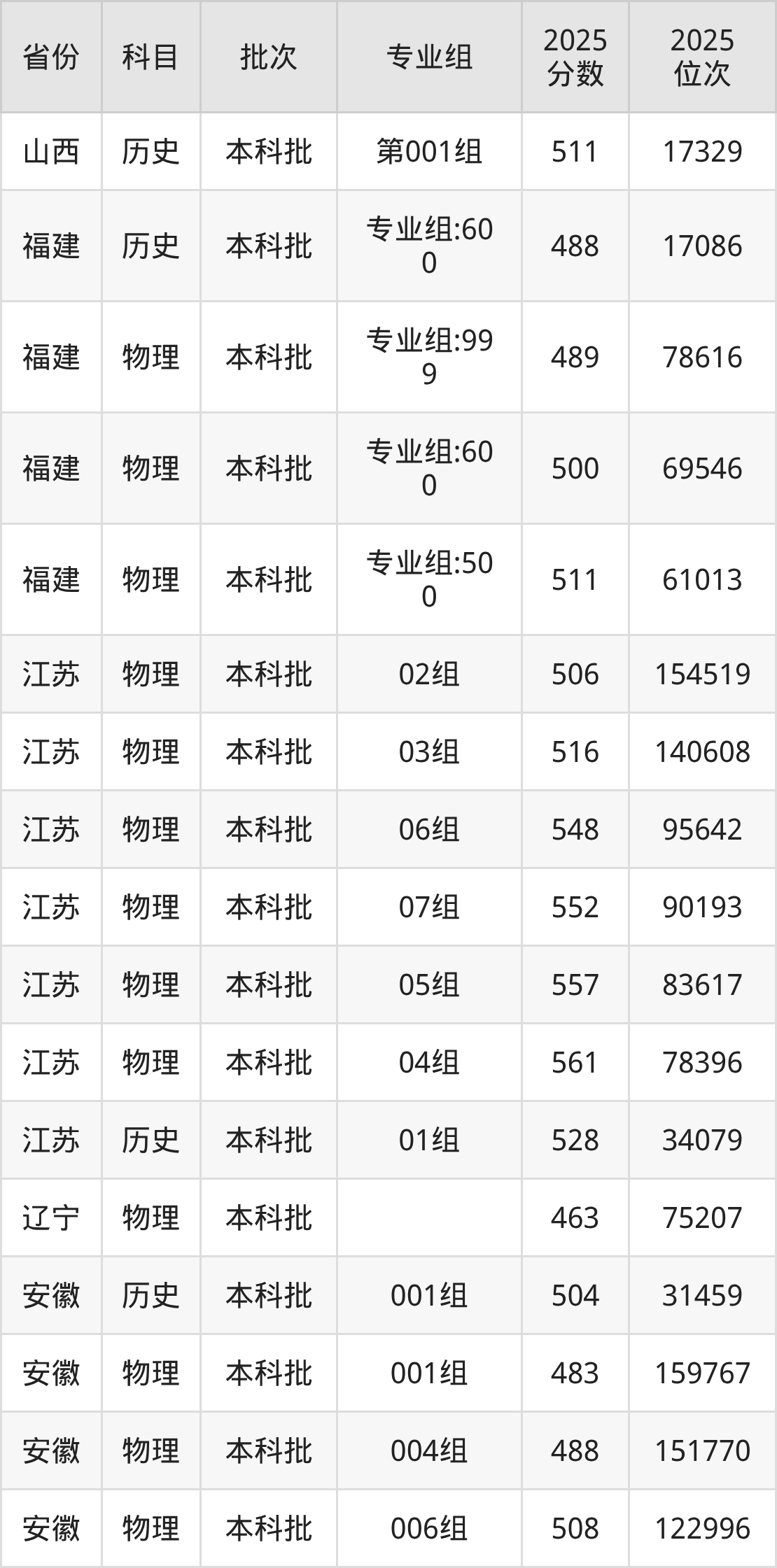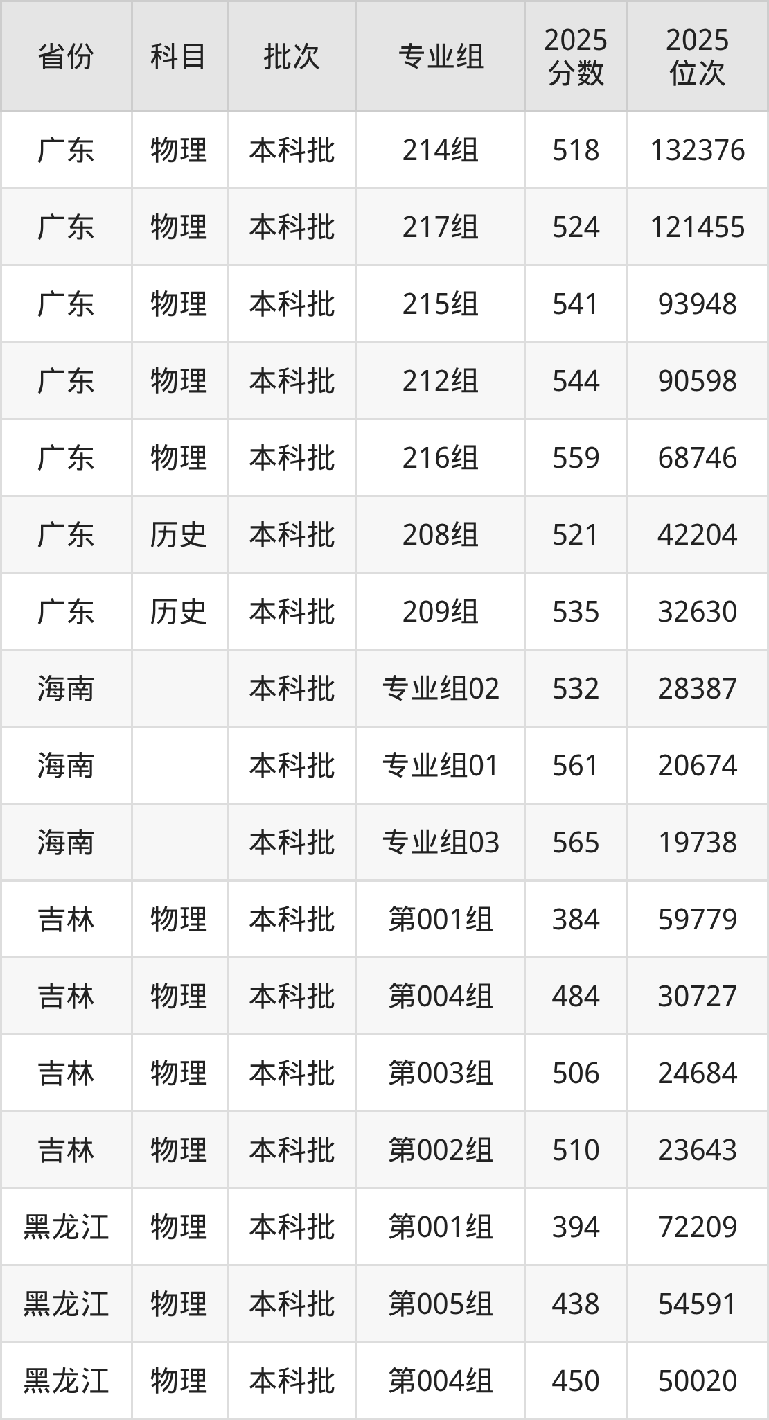 2025年在本科物理类进行招生,各专业组分数线详情如下: