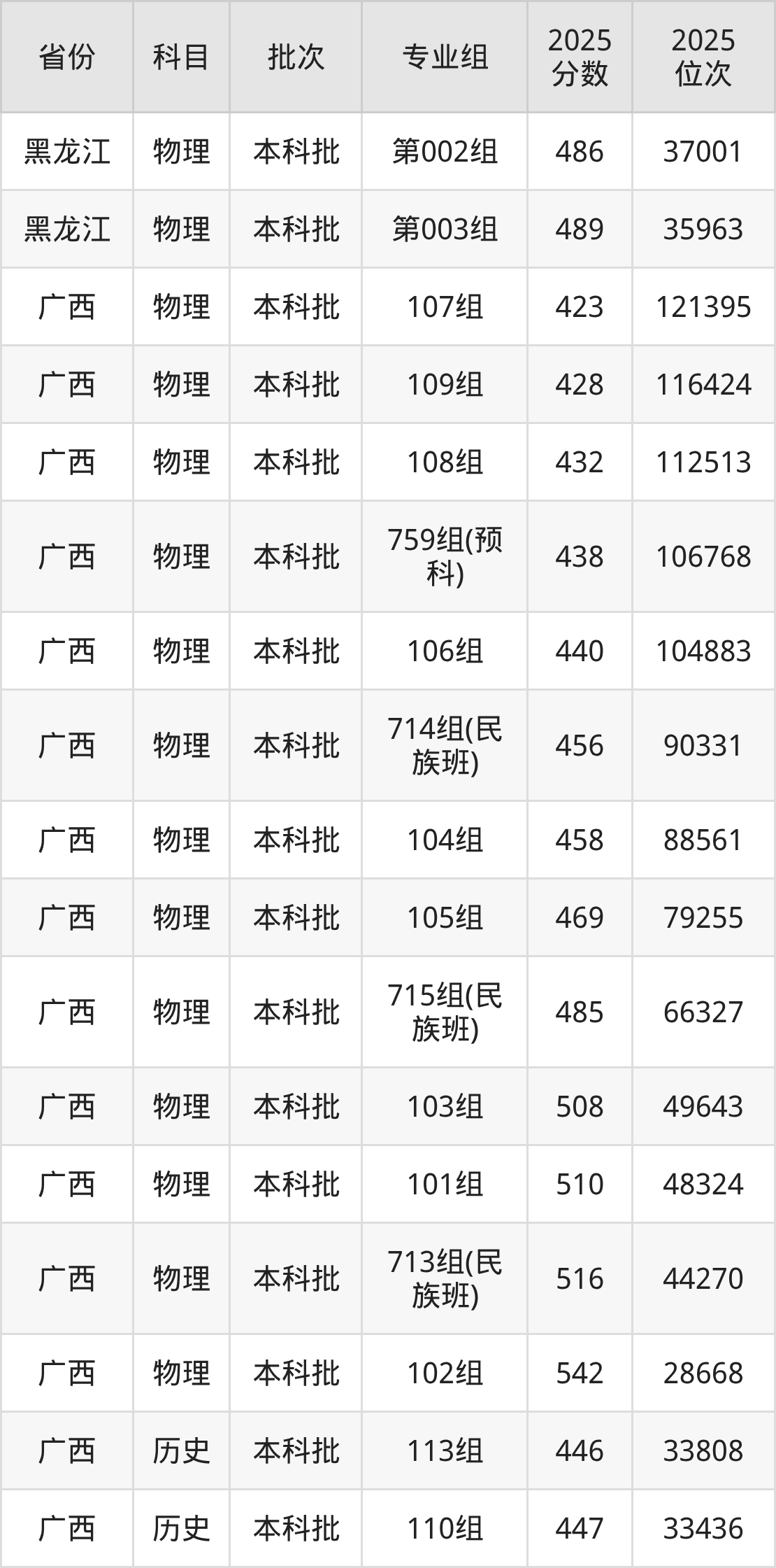 右江民族医学院110组:2025年投档录取最低分为447分,录取最低位次为33436名。