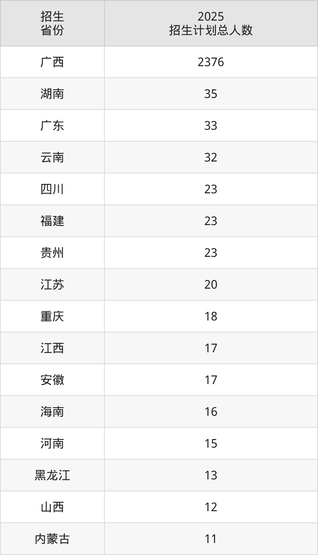 2025年右江民族医学院面向全国20个省市开展本科招生;招生专业共24个,招生人数共2718人。2025年在广西壮族自治区招生计划总人数是2376人,其中,右江民族医学院在广西壮族自治区招生人数最多的是临床医学。右江民族医学院在各省具体招生人数情况如下表。