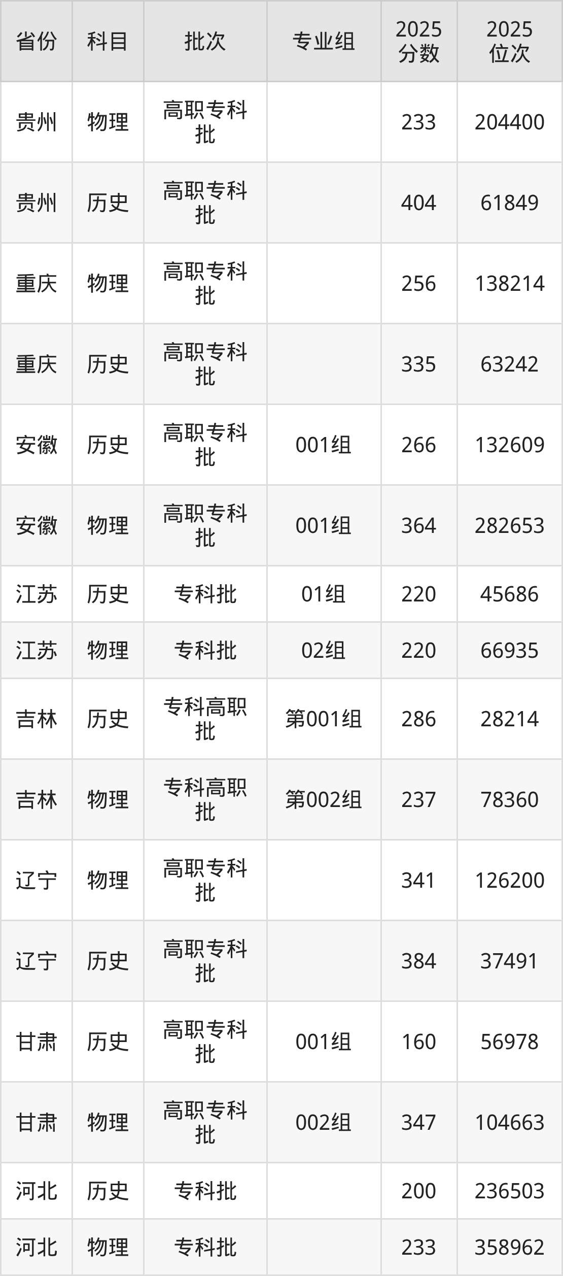 2025年宿迁职业技术学院全国录取分数线是160分到404分,录取最低在甘肃历史类(001组)、录取最高在贵州历史类。各省各专业组最低分具有差异,详情如下: