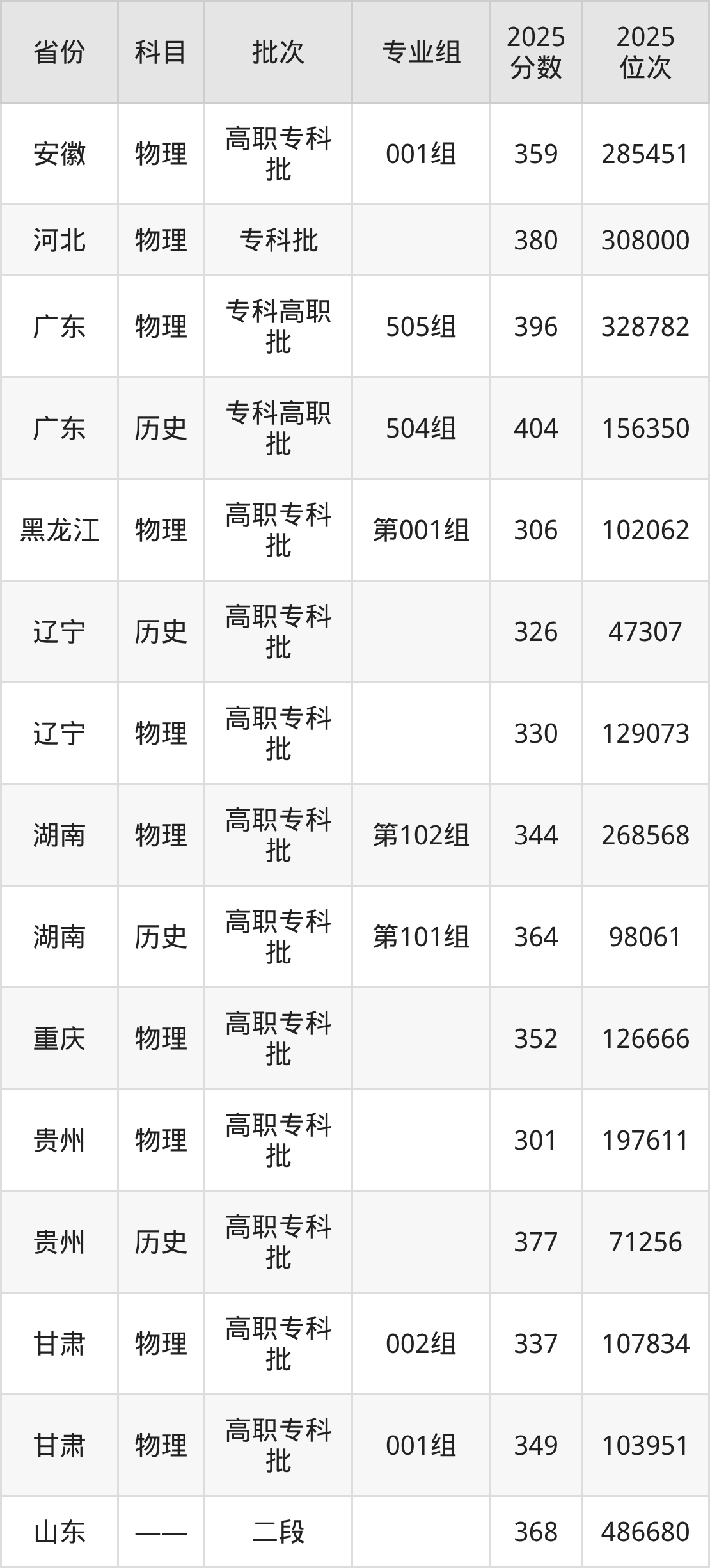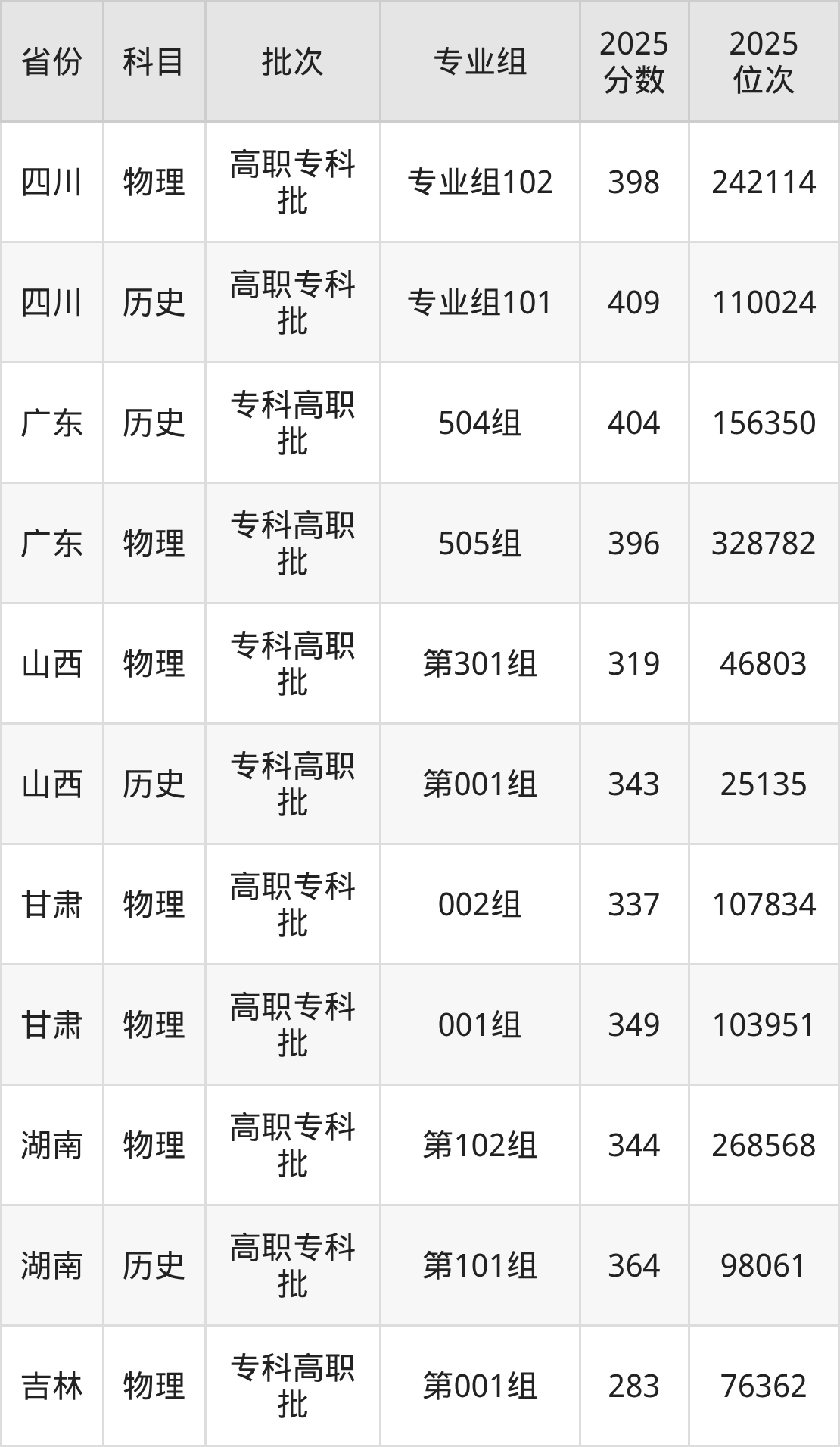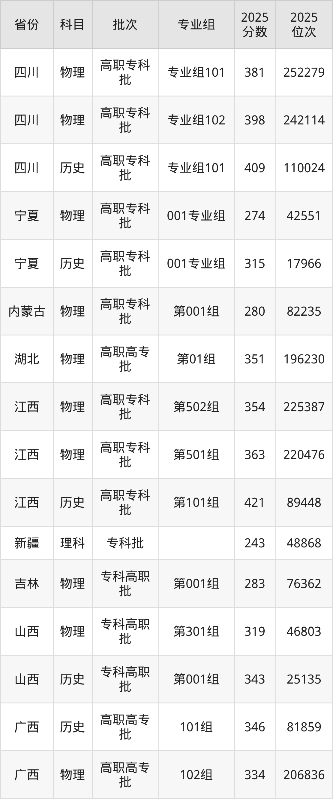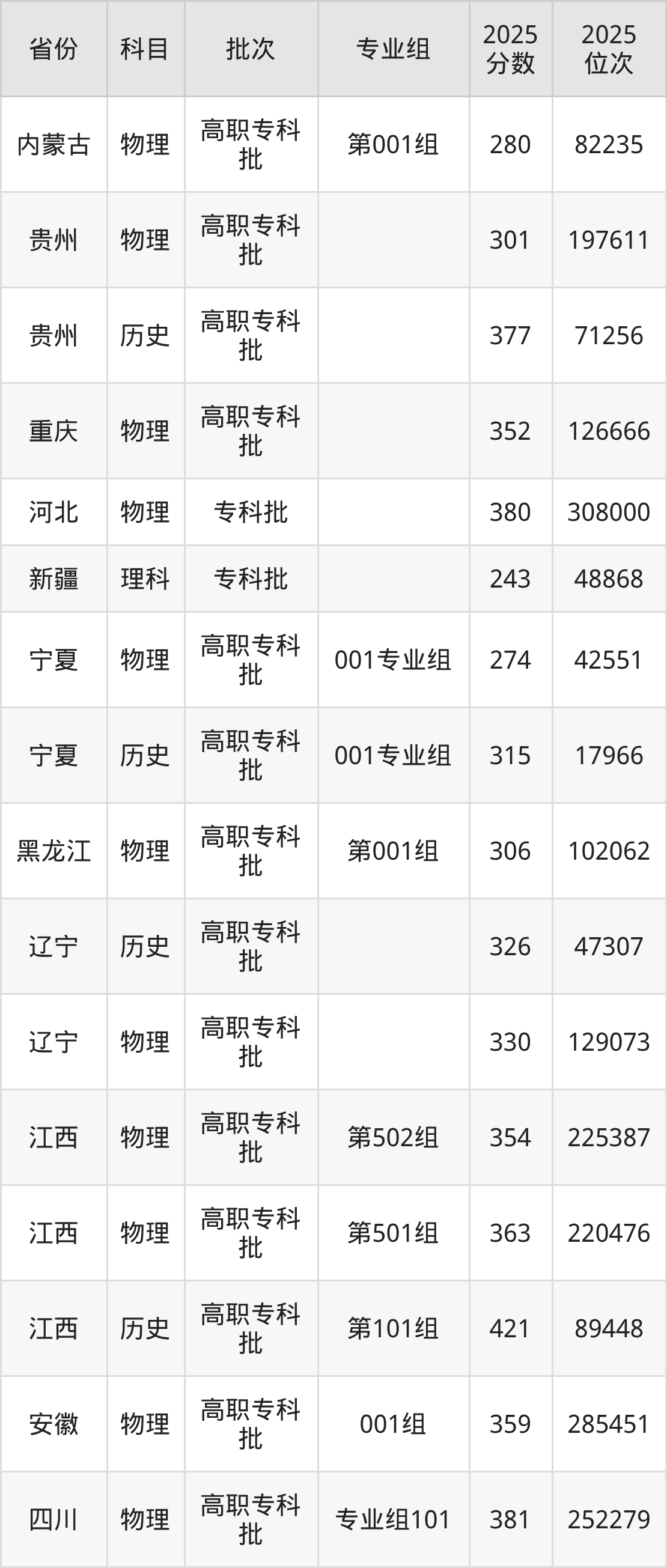2025年在专科物理类进行招生,各专业组分数线详情如下: