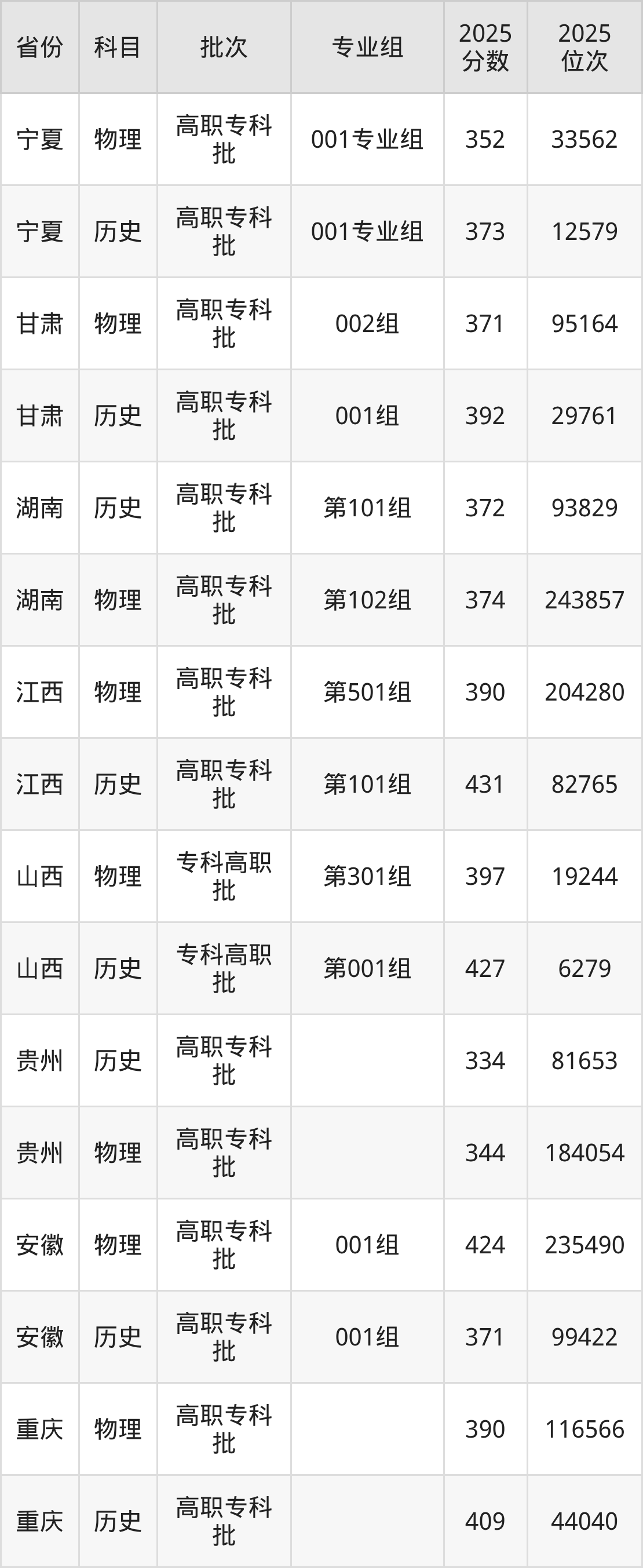 普通类专科物理类最低352分,专科历史类最低373分