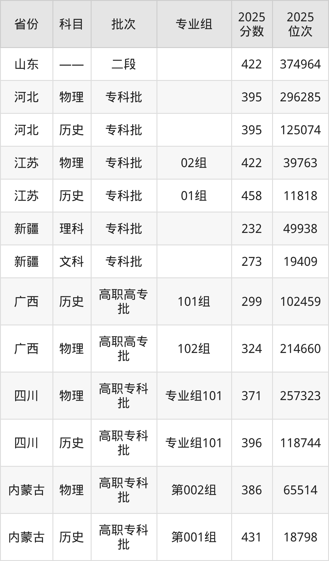 普通类专科物理类最低371分,专科历史类最低396分