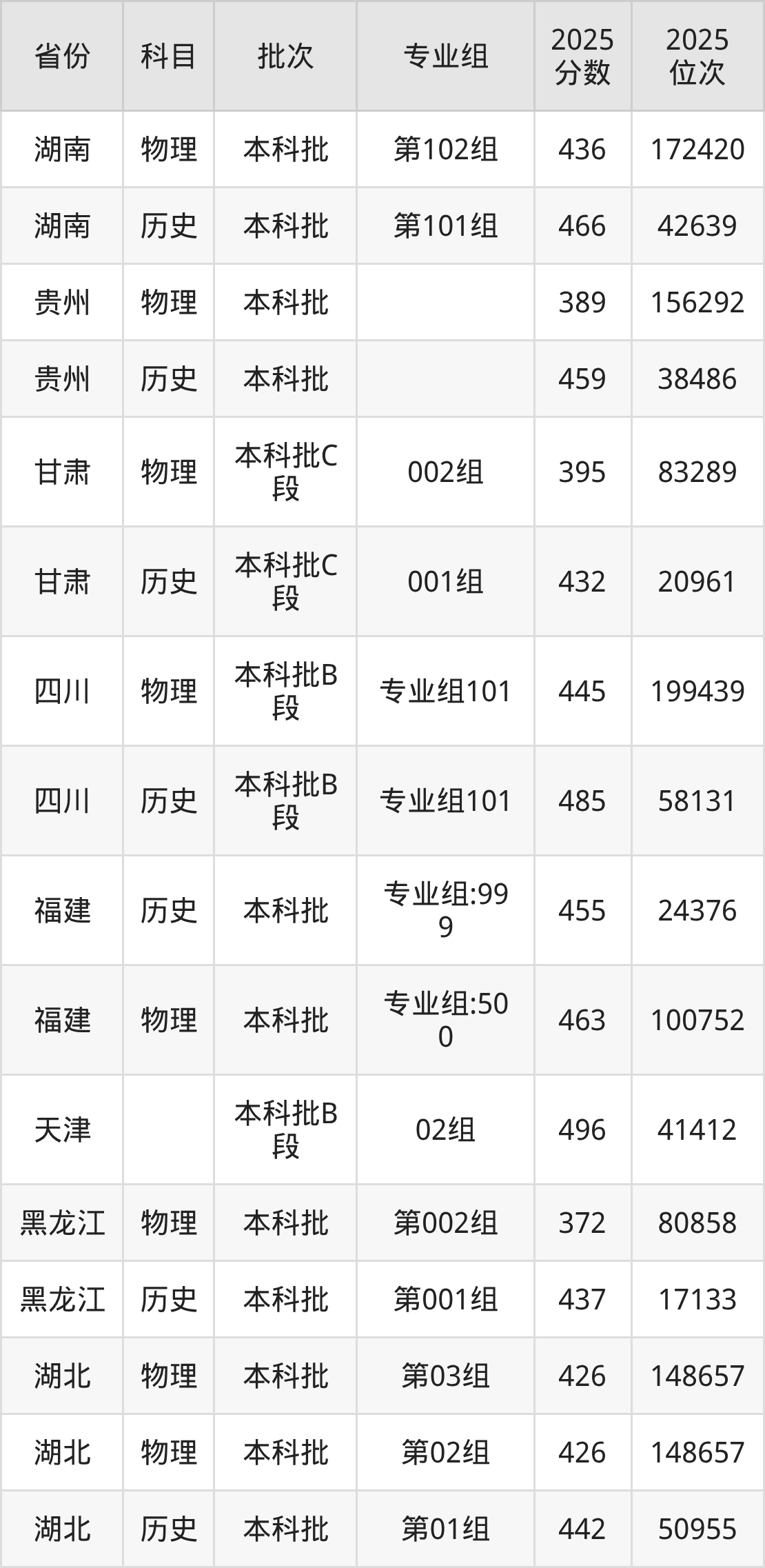 2025年投档录取最低分为284分,录取最低位次为43416名。