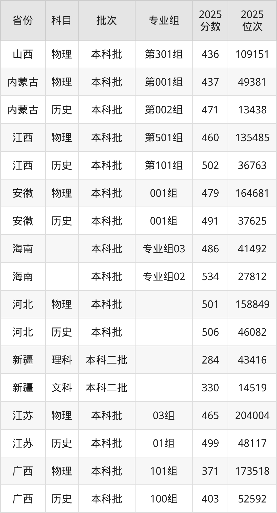 2025年在本科物理类进行招生,各专业组分数线详情如下: