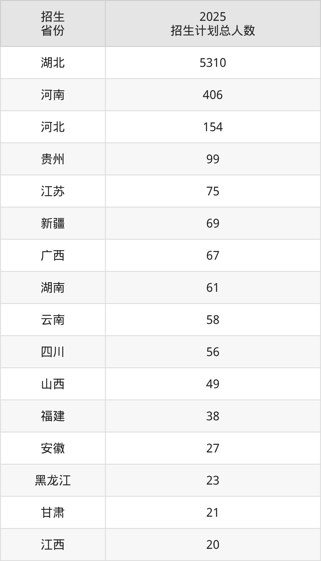 2025年武汉工程科技学院面向全国20个省市开展本科招生;招生专业共21个,招生人数共2411人。2025年在湖北省招生计划总人数是5310人,其中,武汉工程科技学院在湖北省招生人数最多的是机电一体化技术。武汉工程科技学院在各省具体招生人数情况如下表。