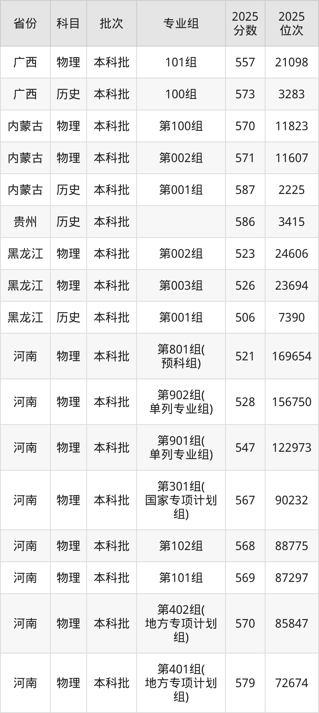 河南财经政法大学第401组(地方专项计划组):2025年投档录取最低分为579分,录取最低位次为72674名。