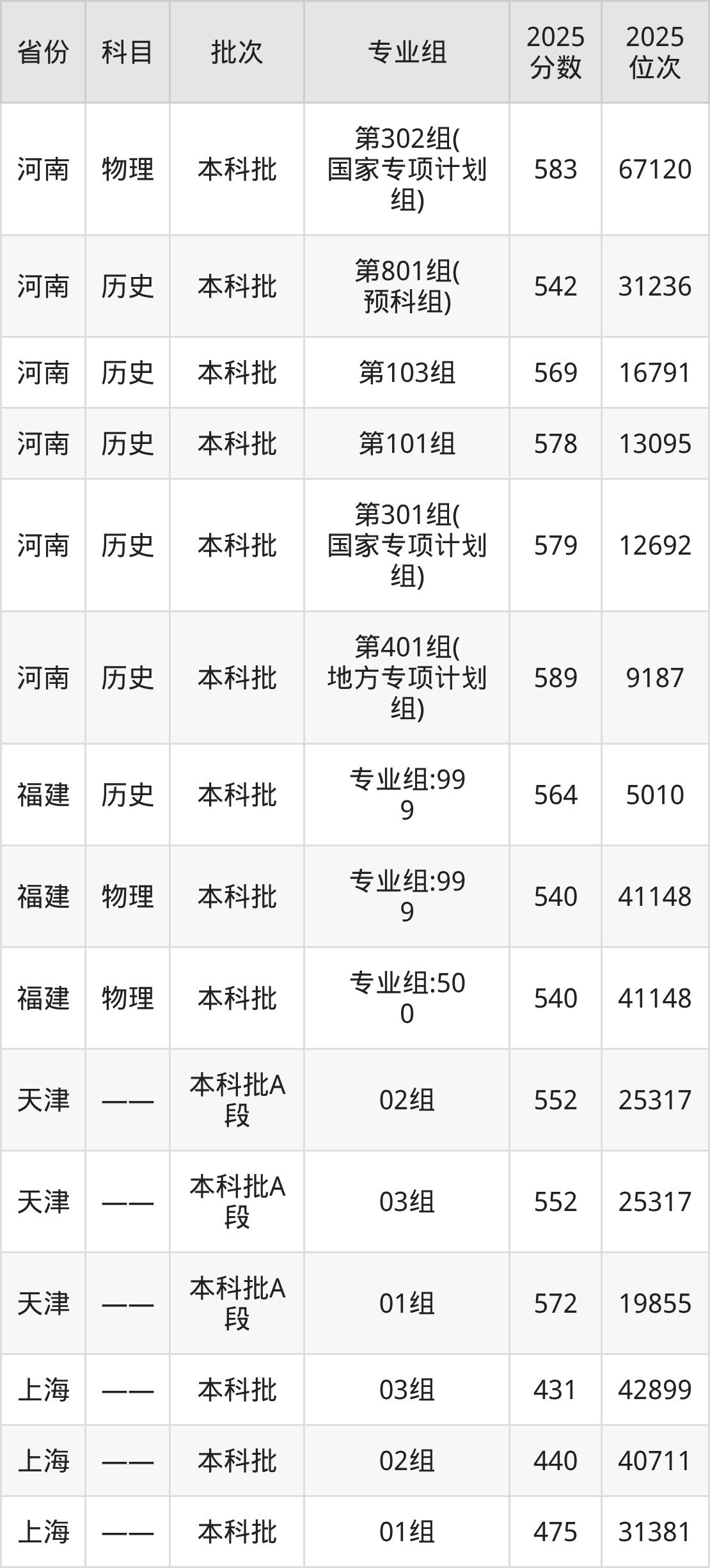 河南财经政法大学第302组(国家专项计划组):2025年投档录取最低分为583分,录取最低位次为67120名。