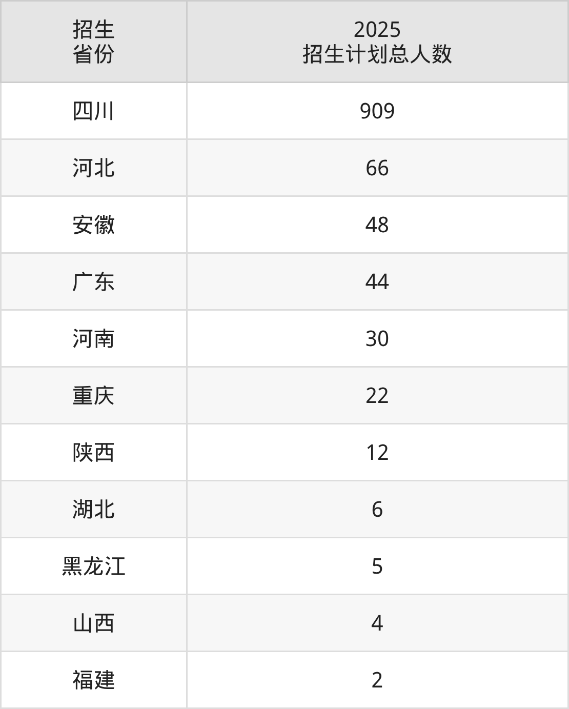 2025年四川电影电视学院面向全国11个省市开展本科招生;招生专业共10个,招生人数共819人。2025年在四川省招生计划总人数是909人,其中,四川电影电视学院在四川省招生人数最多的是广播电视编导。四川电影电视学院在各省具体招生人数情况如下表。