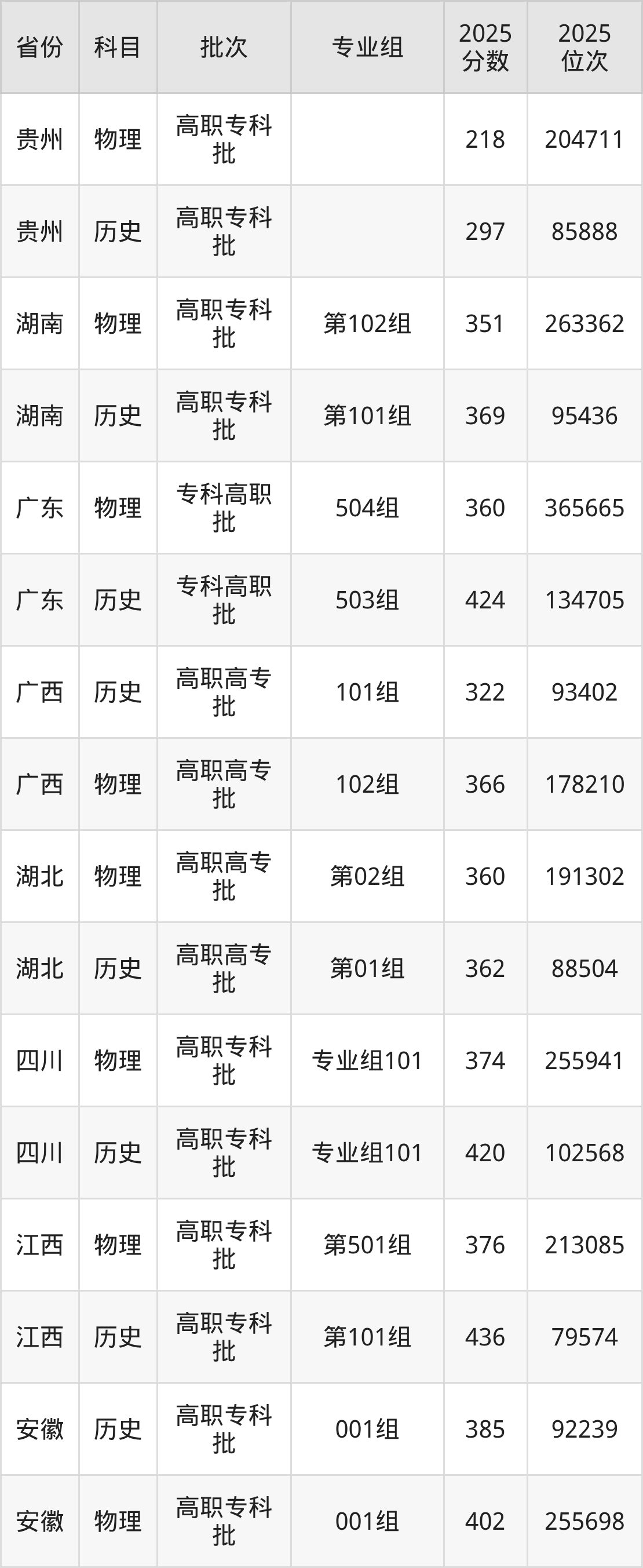普通类专科物理类最低376分,专科历史类最低436分
