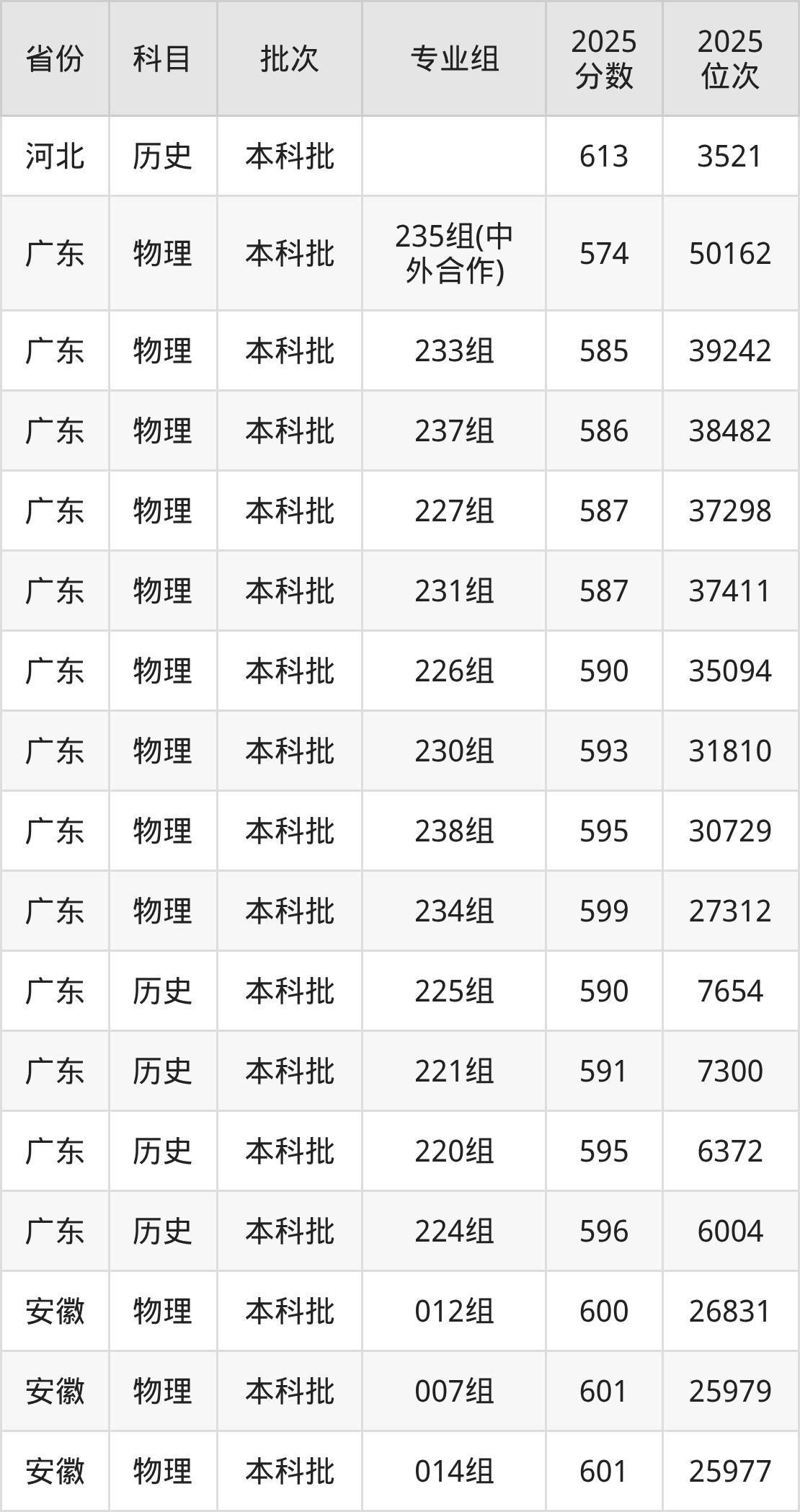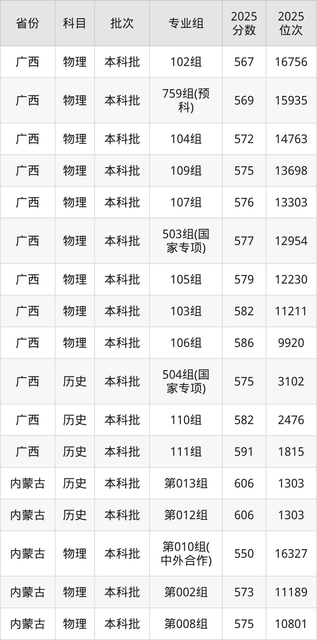 2025年在本科历史类进行招生,各专业组分数线详情如下: