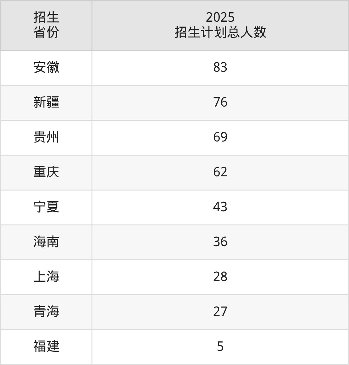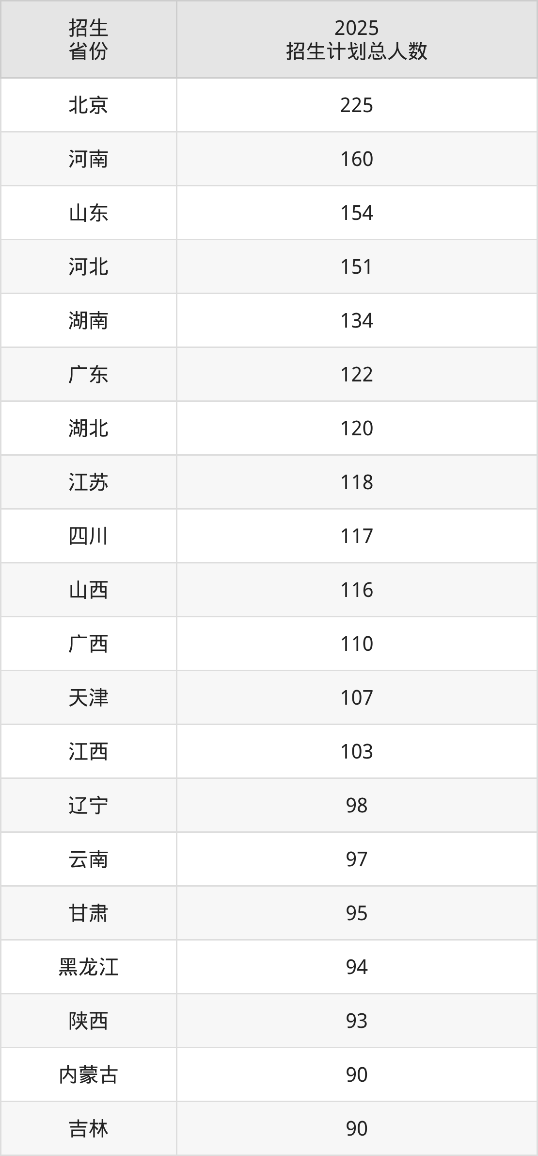 2025年北京林业大学面向全国29个省市开展本科招生;招生专业共52个,招生人数共2823人。2025年在北京市招生计划总人数是225人,其中,北京林业大学在北京市招生人数最多的是计算机类。北京林业大学在各省具体招生人数情况如下表。