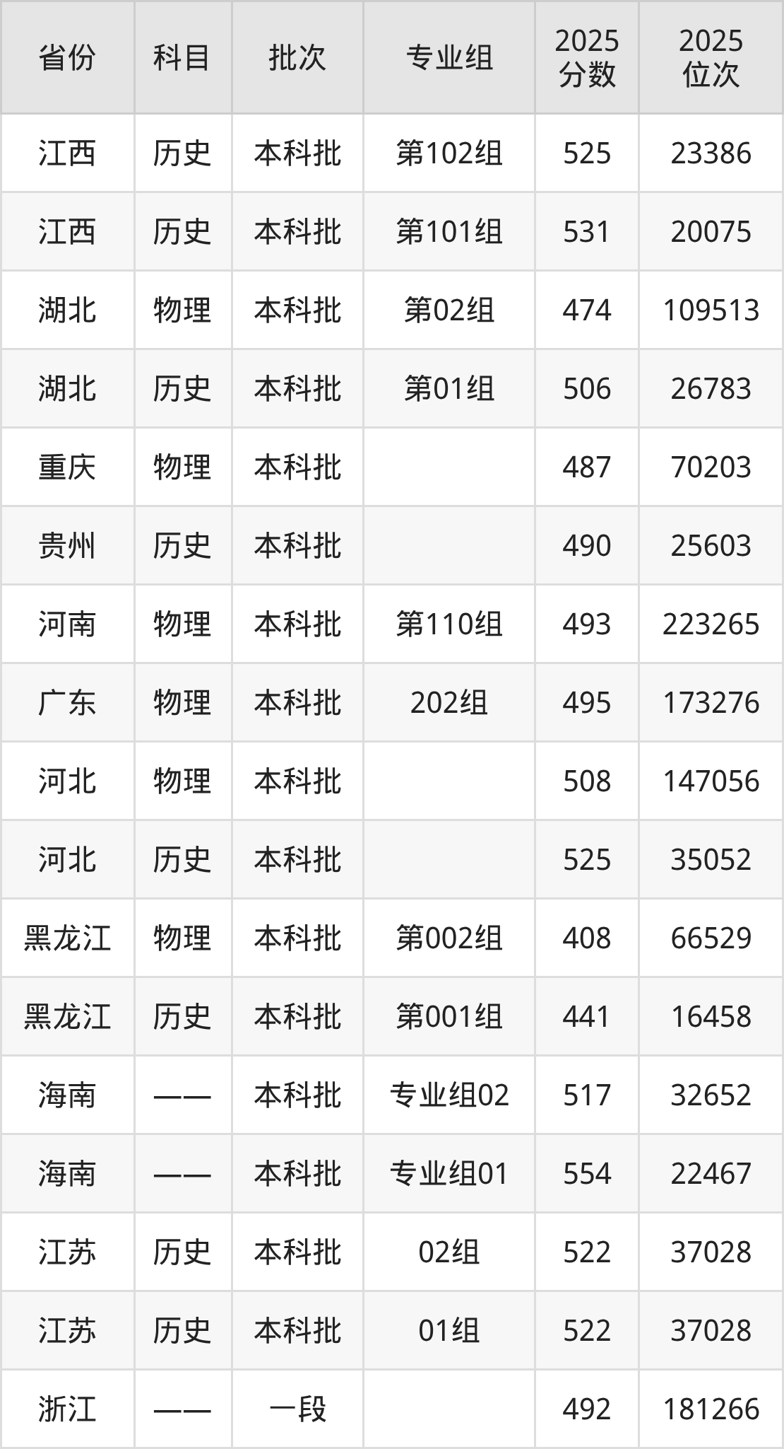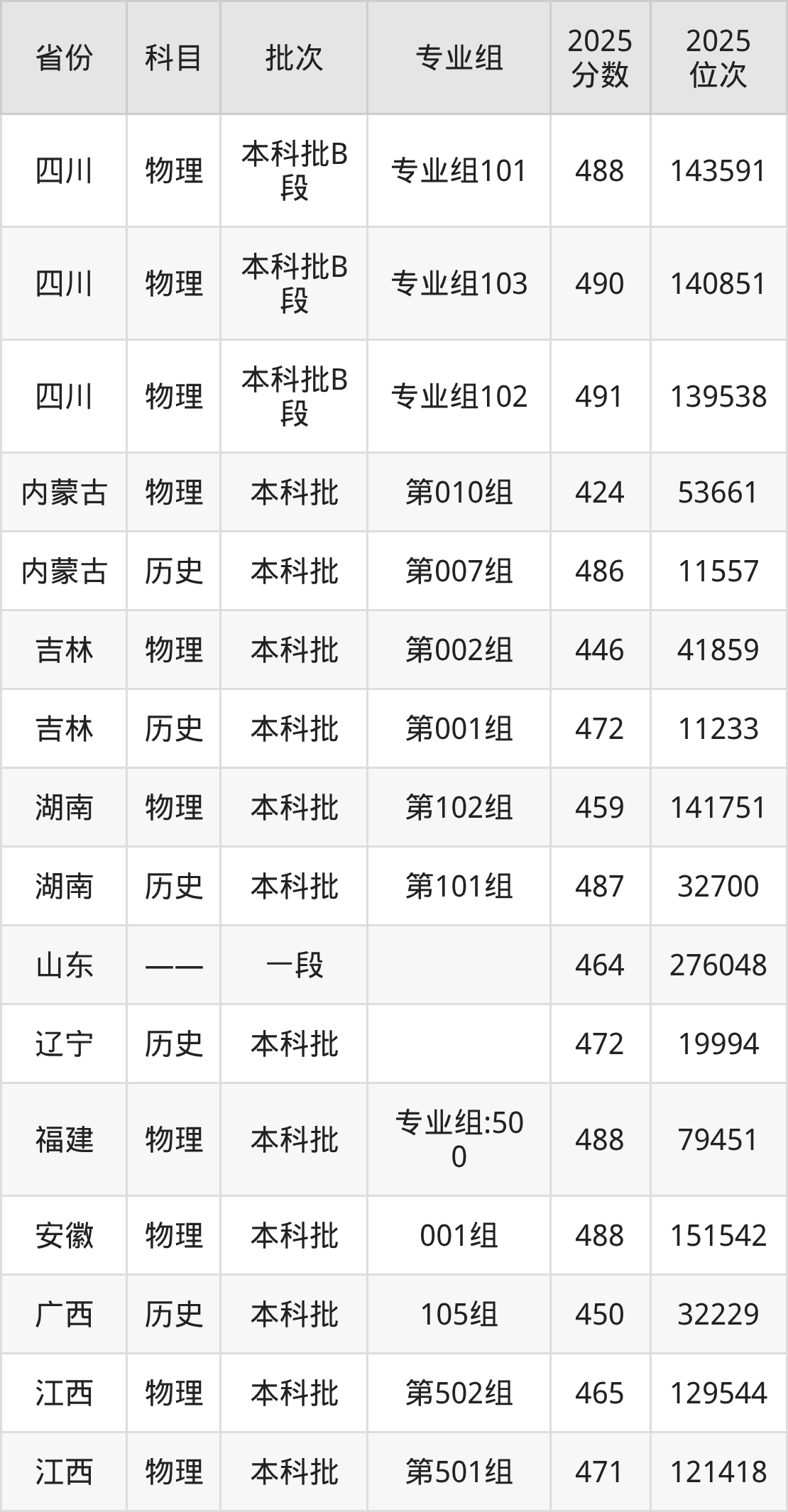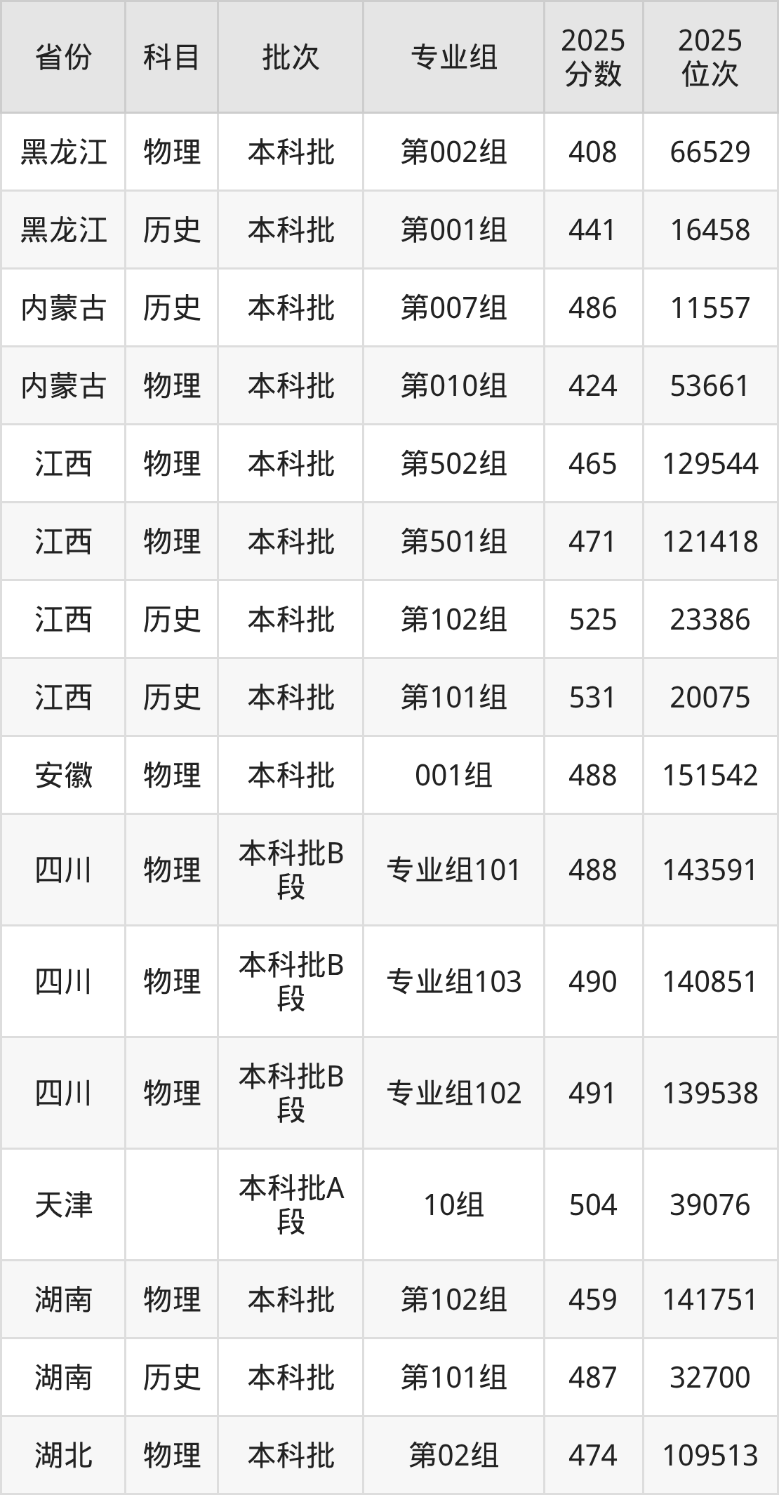 2025年在本科物理类进行招生,各专业组分数线详情如下: