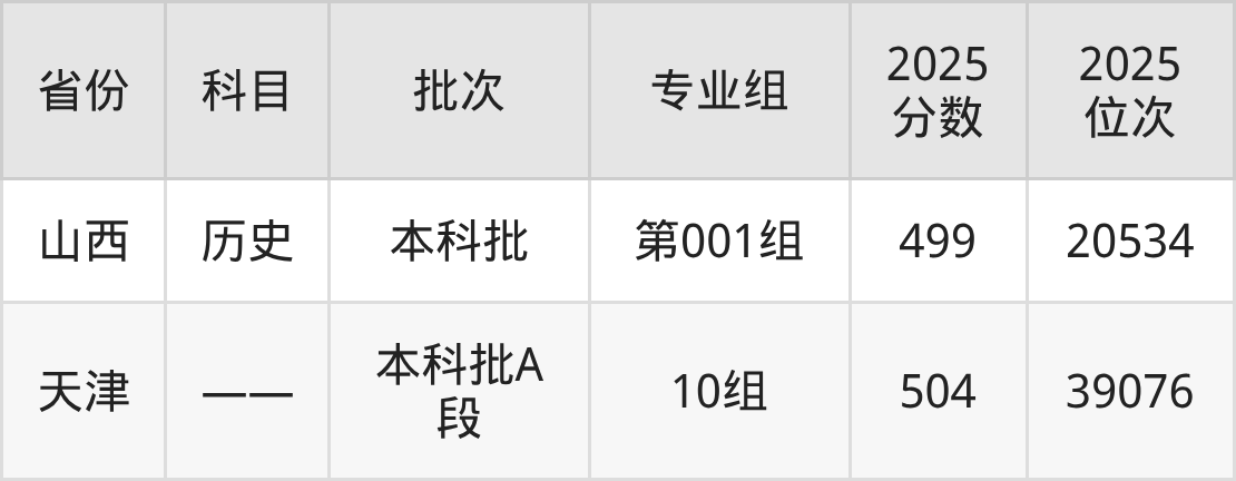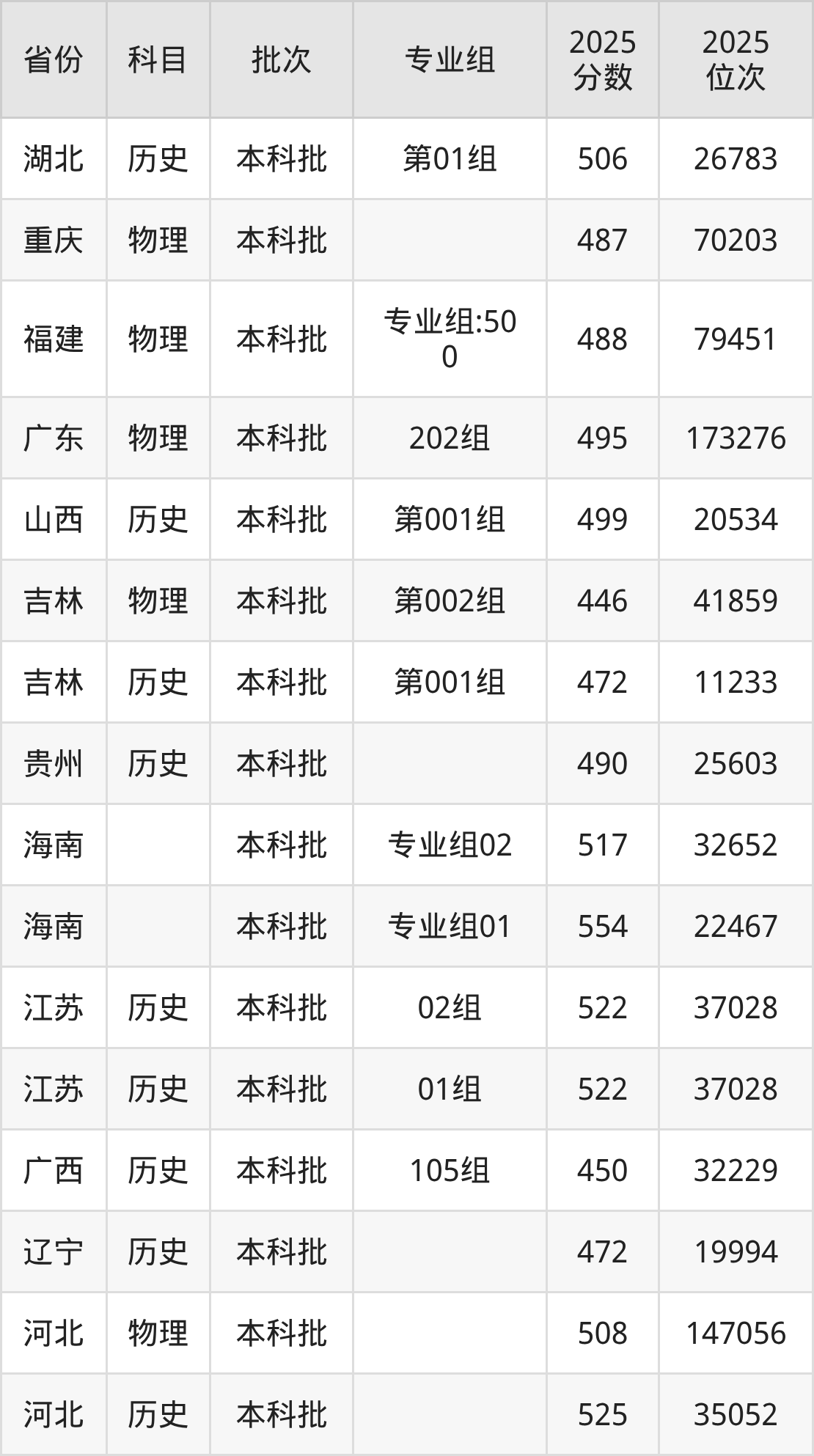 2025年在本科历史类进行招生,各专业组分数线详情如下: