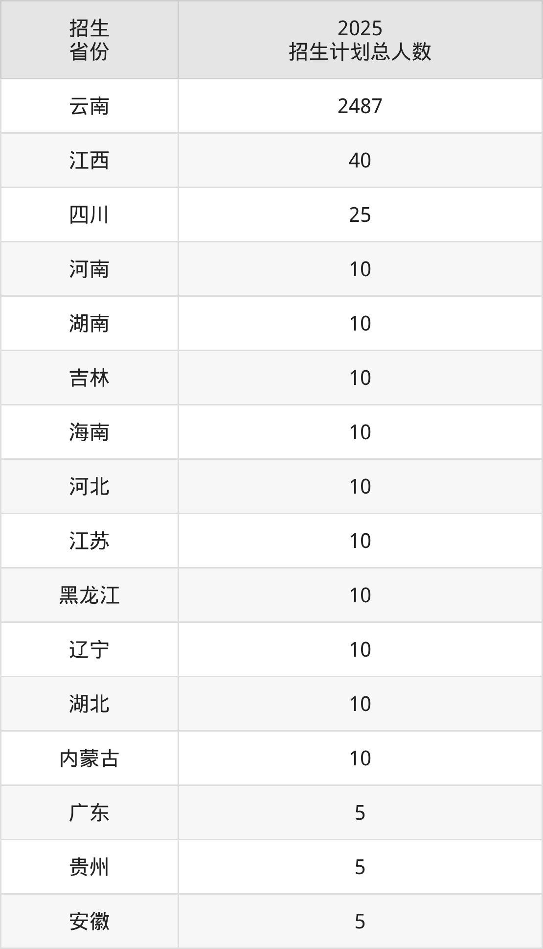 2025年普洱学院面向全国22个省市开展本科招生;招生专业共35个,招生人数共2696人。2025年在云南省招生计划总人数是2487人,其中,普洱学院在云南省招生人数最多的是小学教育。普洱学院在各省具体招生人数情况如下表。