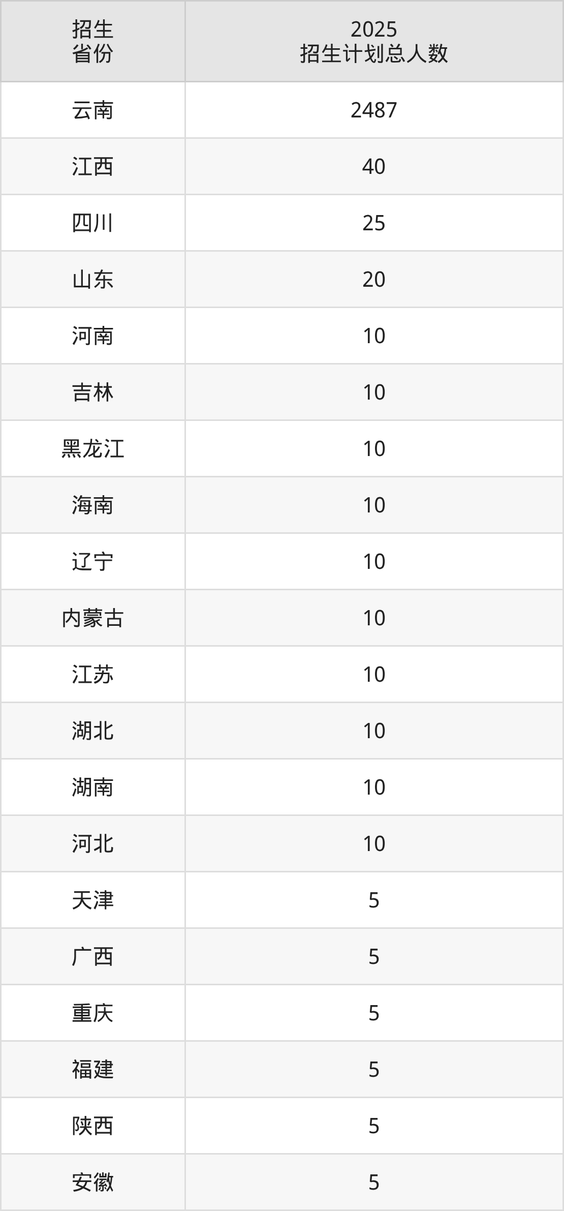 2025年普洱学院面向全国23个省市开展本科招生;招生专业共35个,招生人数共2716人。2025年在云南省招生计划总人数是2487人,其中,普洱学院在云南省招生人数最多的是小学教育。普洱学院在各省具体招生人数情况如下表。