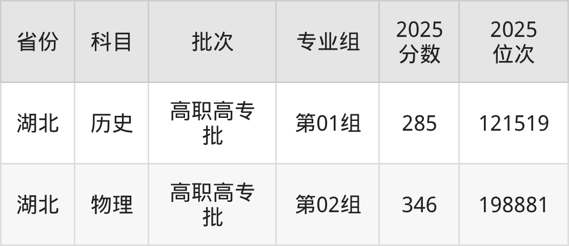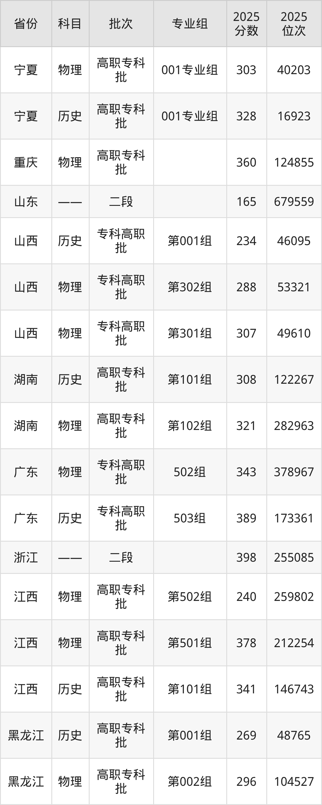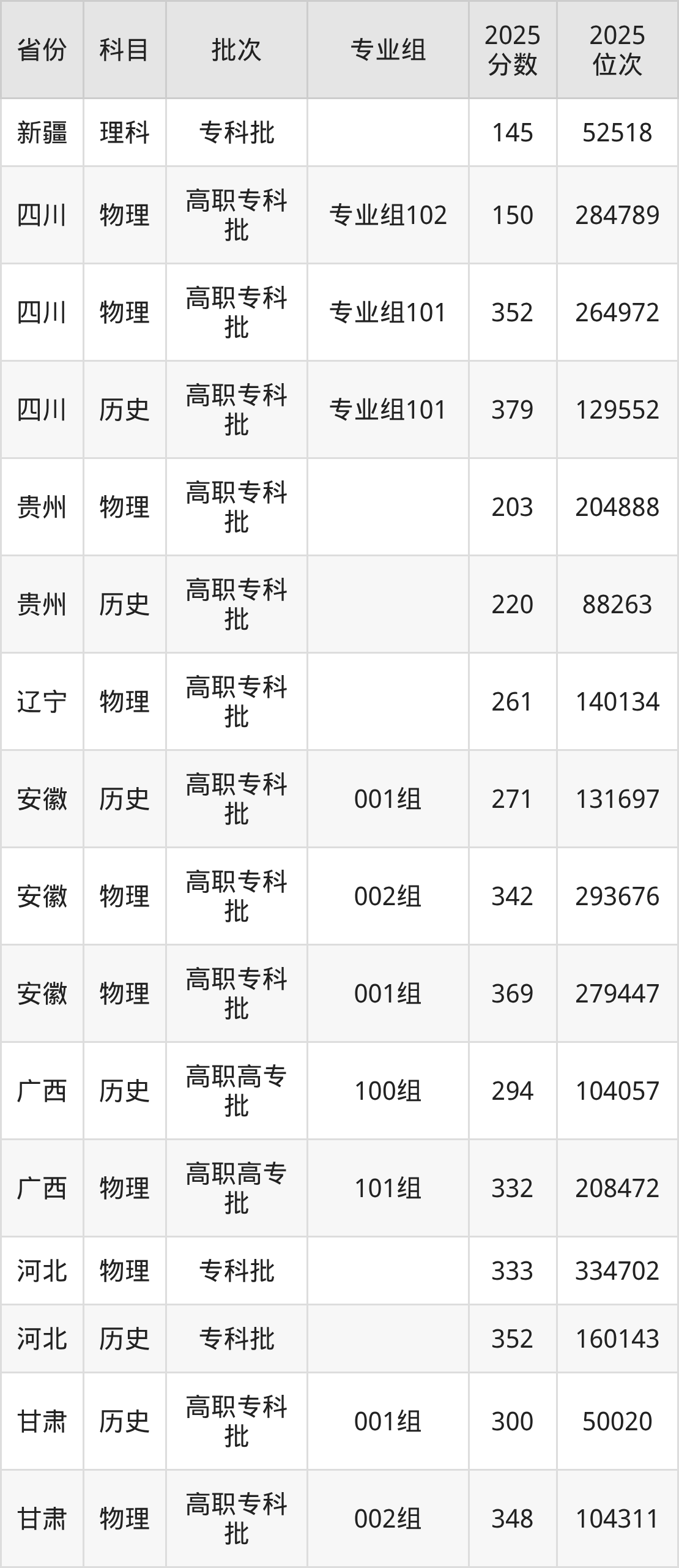 2025年在专科物理类进行招生,各专业组分数线详情如下: