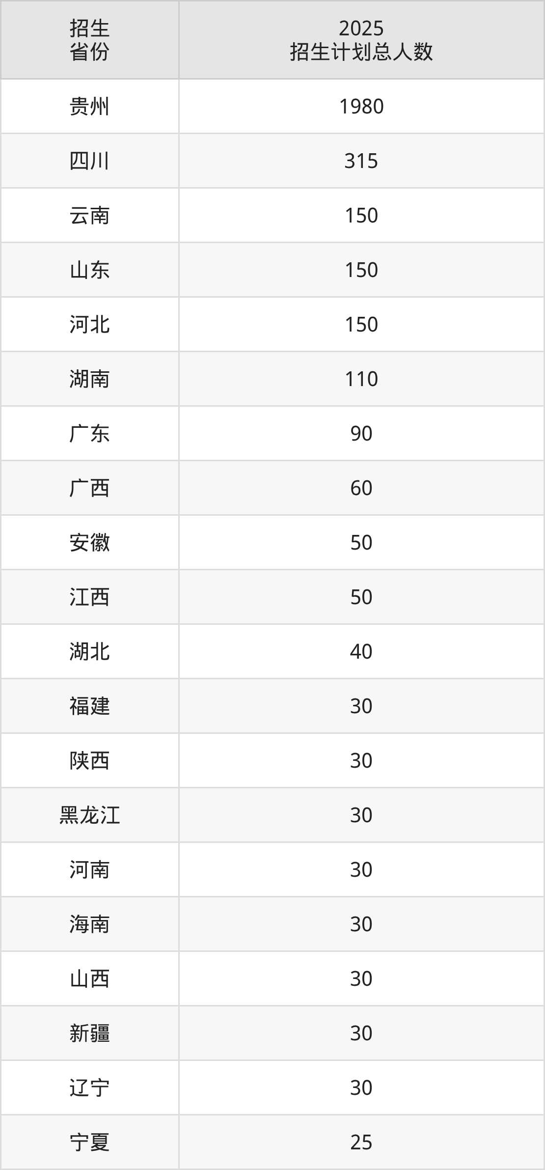 2025年贵州电子信息职业技术学院面向全国23个省市开展专科招生;招生专业共24个,招生人数共3465人。2025年在贵州省招生计划总人数是1980人,其中,贵州电子信息职业技术学院在贵州省招生人数最多的是新能源汽车技术。贵州电子信息职业技术学院在各省具体招生人数情况如下表。