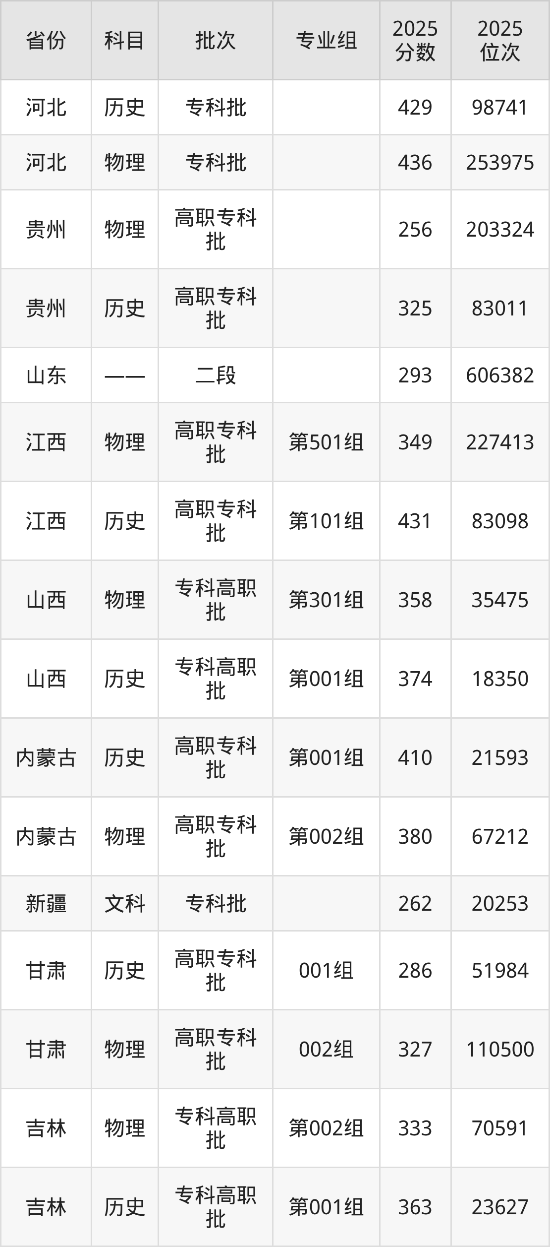 济宁职业技术学院第001组:2025年投档录取最低分为363分,录取最低位次为23627名。