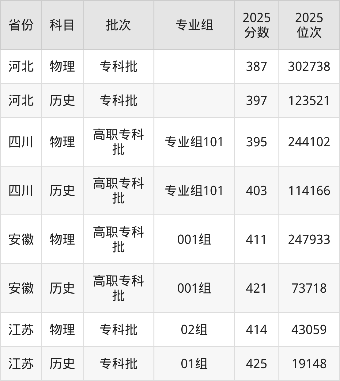 安徽工业经济职业技术学院01组:2025年投档录取最低分为425分,录取最低位次为19148名。